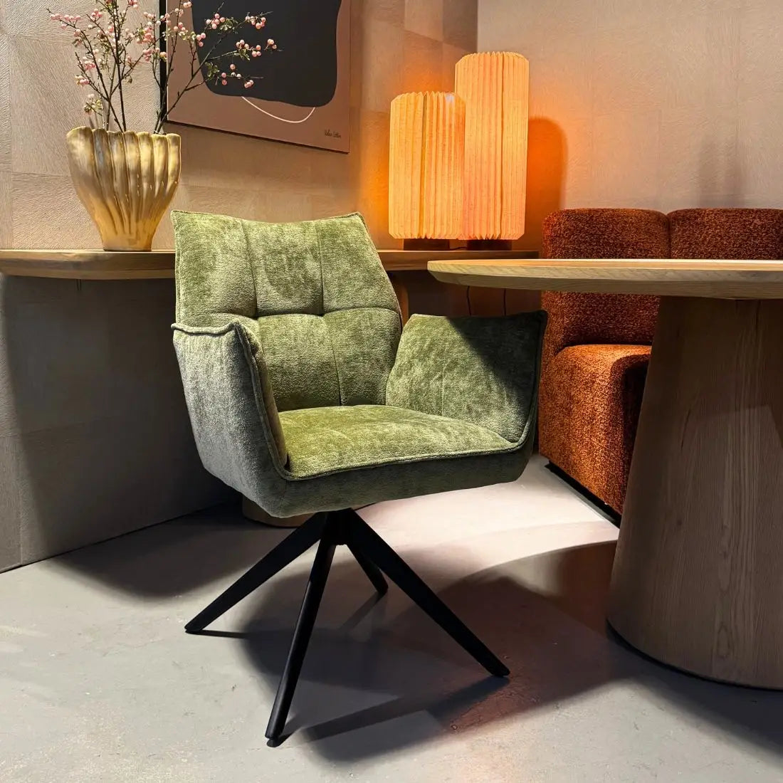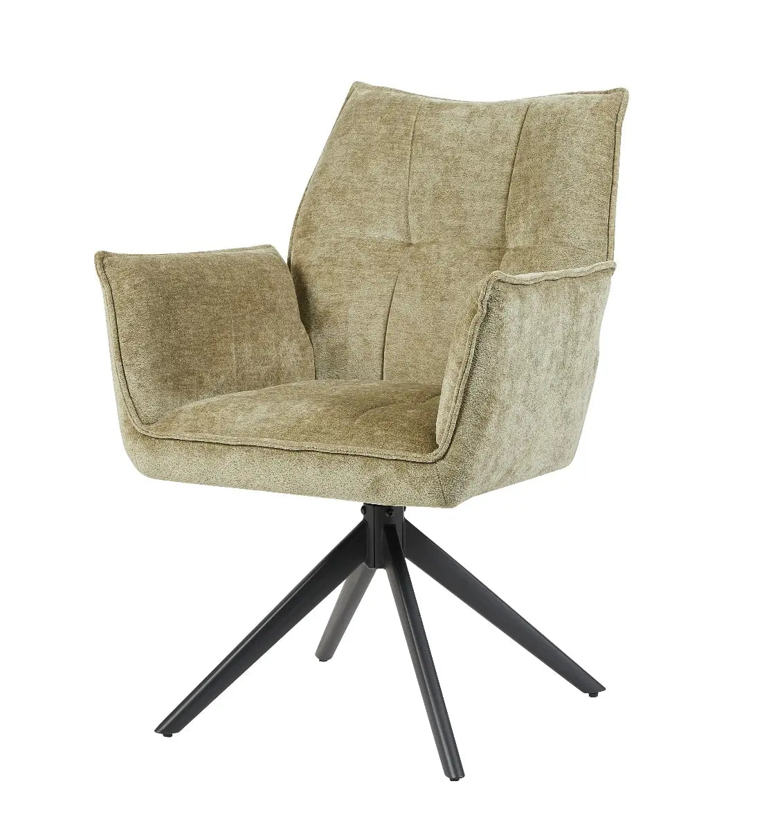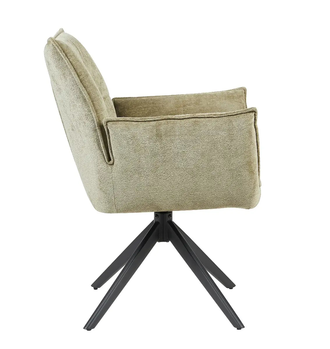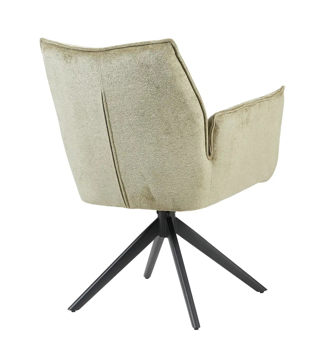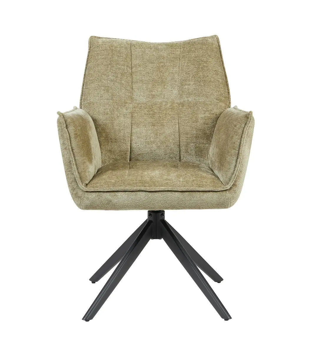 De stoel Charlie van Reefs Interior is een perfecte balans tussen comfort, elegantie en praktisch design. De zachte bekleding in een natuurlijke groentint geeft de stoel een rustgevende, eigentijdse uitstraling die moeiteloos aansluit bij uiteenlopende interieurstijlen. Het zwarte metalen onderstel zorgt voor een modern accent en biedt een stabiele basis. Dankzij het 360 graden draaibare frame met auto return functie draait de stoel soepel mee en keert hij automatisch terug naar zijn oorspronkelijke positie, wat zorgt voor een nette en praktische indeling rond de tafel.