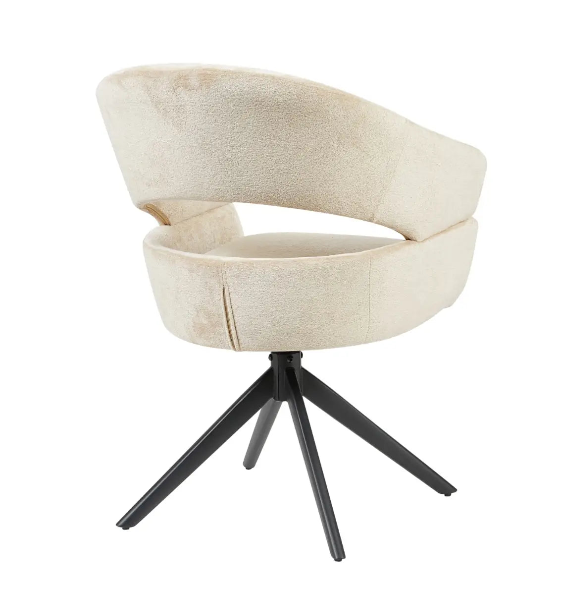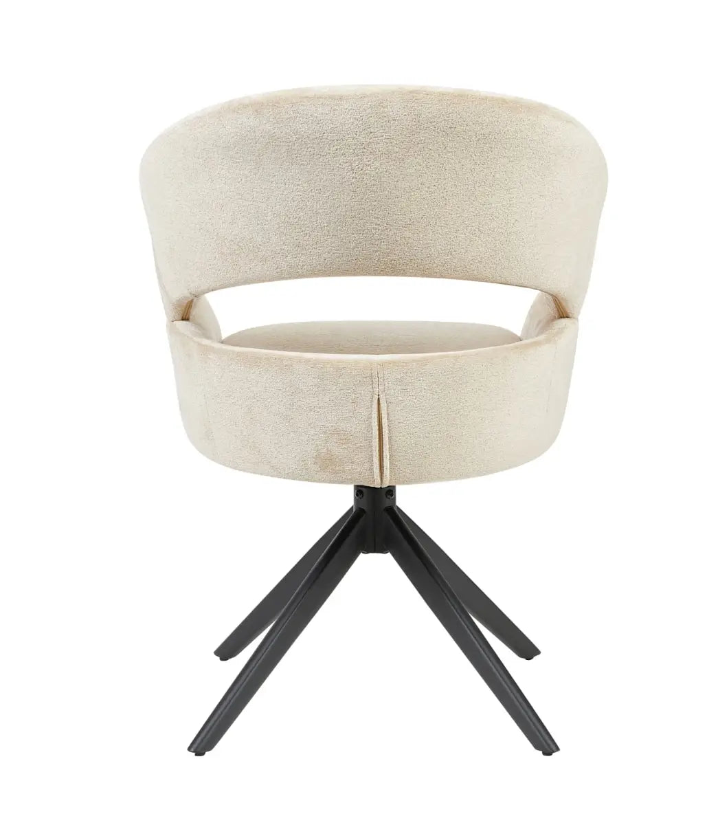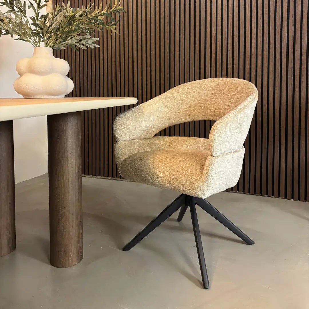 De stoel Julia van Reefs Interior straalt tijdloze elegantie uit met haar verfijnde vormen en zachte bekleding in een warme natural tint. Het design is modern en luchtig dankzij de open rugleuning, terwijl de ronde lijnen zorgen voor een uitnodigend karakter. De stoel is uitgevoerd met een stevig zwart metalen onderstel dat niet alleen stabiliteit biedt, maar ook een stijlvol contrast vormt met de lichte bekleding. Dankzij het 360 graden draaibare frame met terugslagfunctie draait Julia soepel mee en keert ze vanzelf terug naar haar oorspronkelijke positie, wat zorgt voor extra comfort en gemak aan tafel.