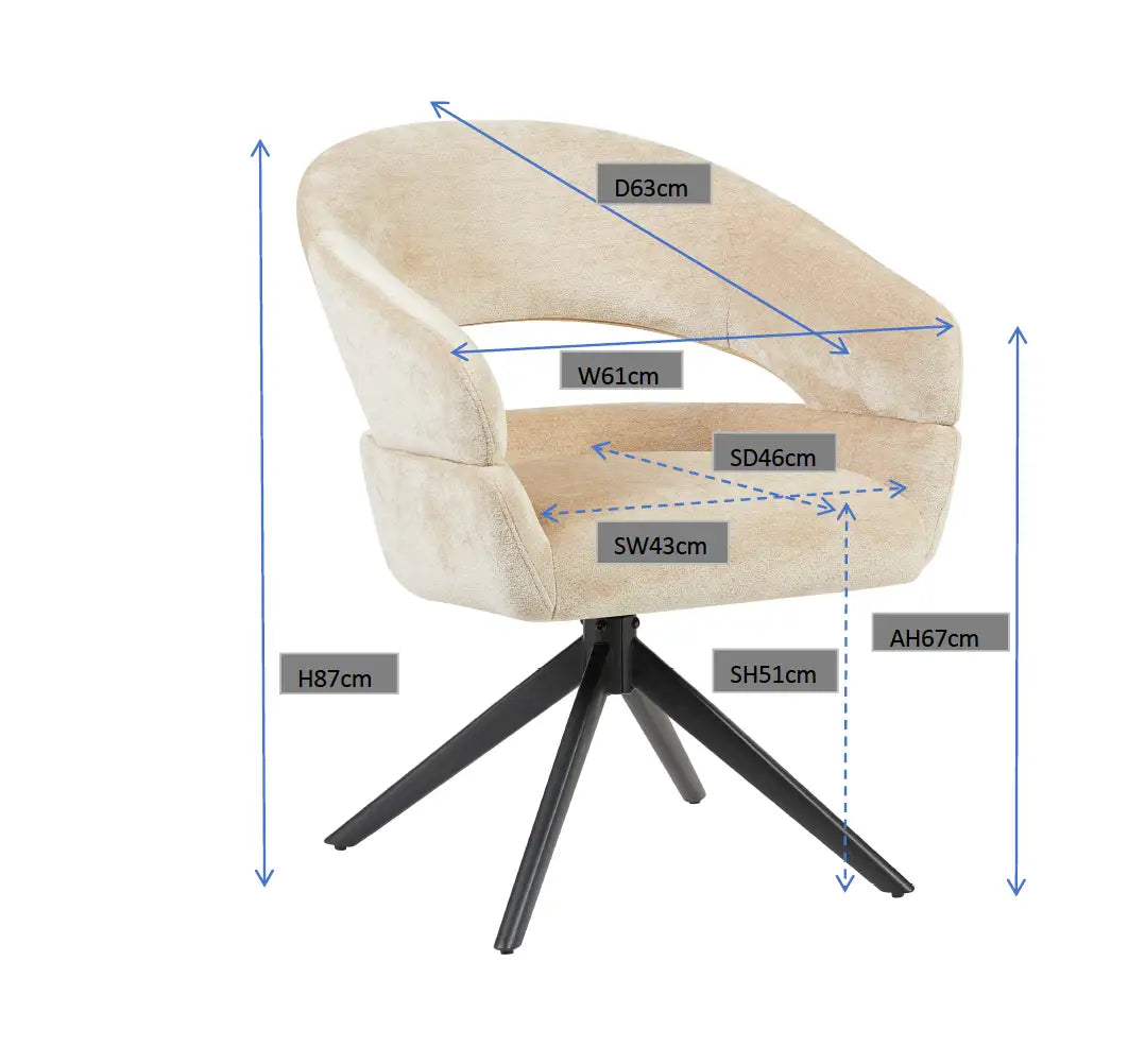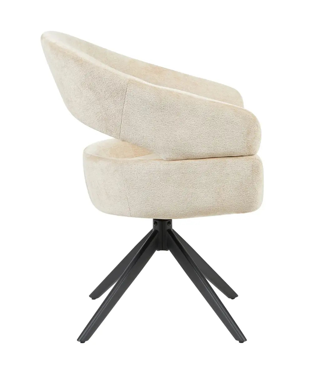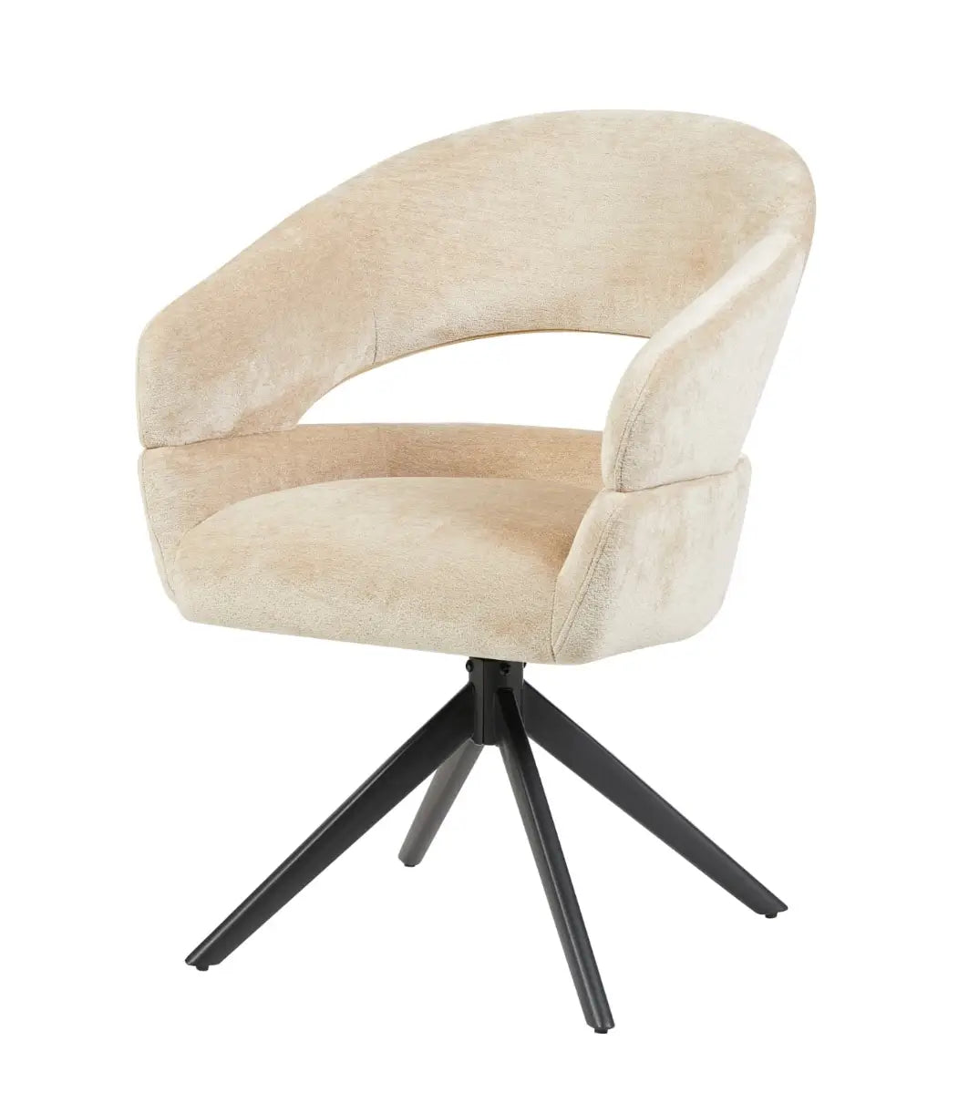 De stoel Julia van Reefs Interior straalt tijdloze elegantie uit met haar verfijnde vormen en zachte bekleding in een warme natural tint. Het design is modern en luchtig dankzij de open rugleuning, terwijl de ronde lijnen zorgen voor een uitnodigend karakter. De stoel is uitgevoerd met een stevig zwart metalen onderstel dat niet alleen stabiliteit biedt, maar ook een stijlvol contrast vormt met de lichte bekleding. Dankzij het 360 graden draaibare frame met terugslagfunctie draait Julia soepel mee en keert ze vanzelf terug naar haar oorspronkelijke positie, wat zorgt voor extra comfort en gemak aan tafel.