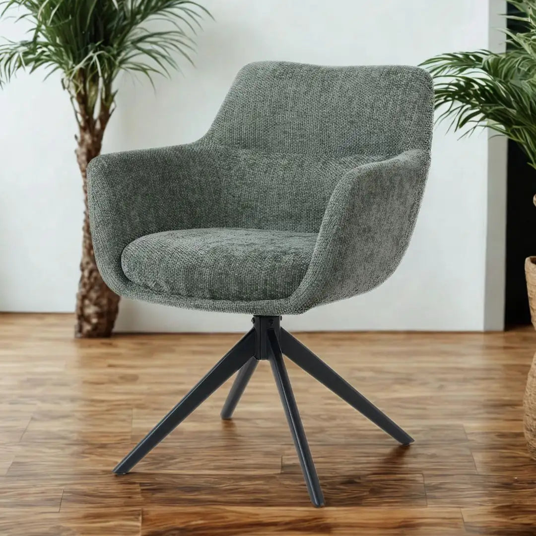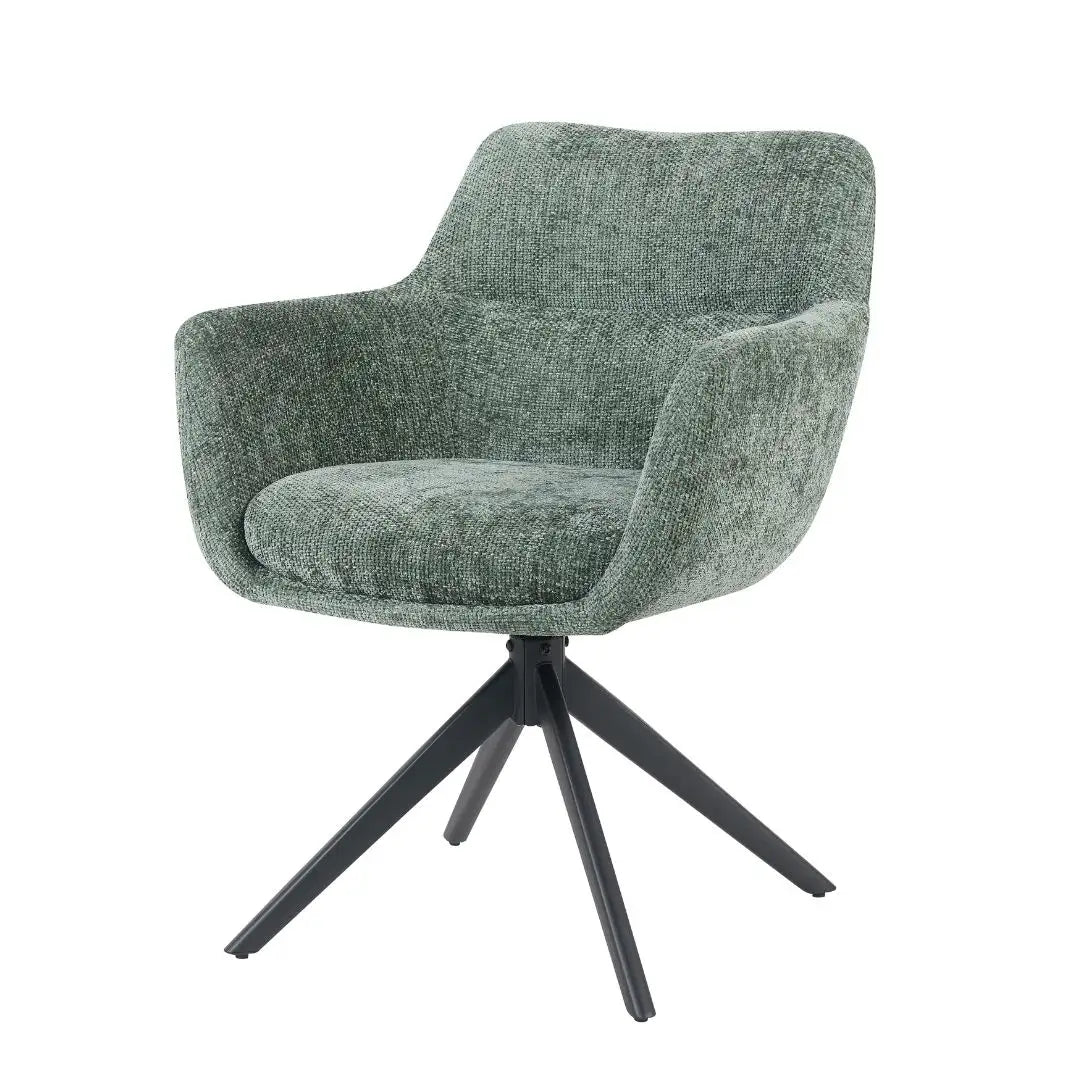De ronde vormgeving van de kuip, in combinatie met de geïntegreerde armleuningen en ondersteunende rugleuning, zorgt voor een aangename zitervaring. Het zwarte metalen onderstel met draaifunctie maakt de stoel extra functioneel, of je ‘m nu aan de eettafel zet of gebruikt als comfortabele werkplekstoel.