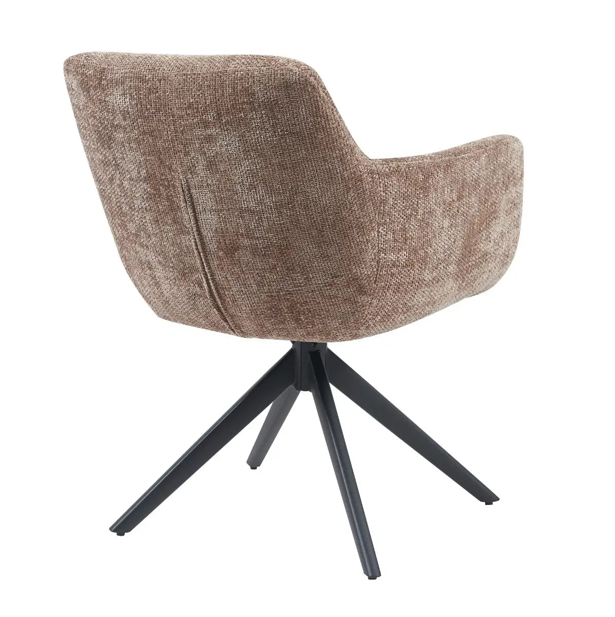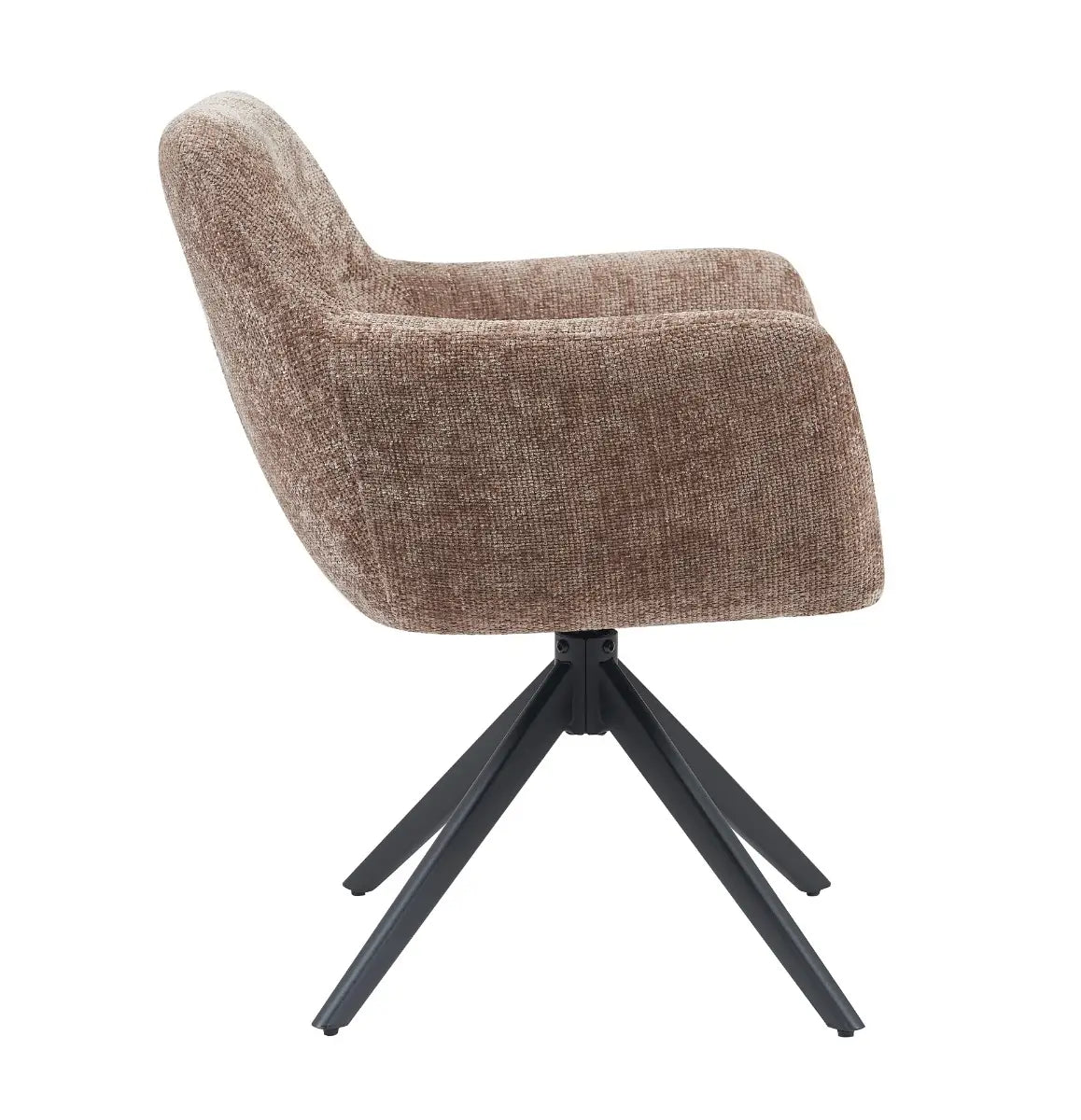 De organische vorm van de zitting, samen met de comfortabele armleuningen en iets hogere rugleuning, zorgt voor een prettige ondersteuning tijdens het tafelen of werken. Het zwarte metalen onderstel geeft de stoel een moderne twist en is voorzien van een soepele draaifunctie, waardoor de stoel ook praktisch is in gebruik.