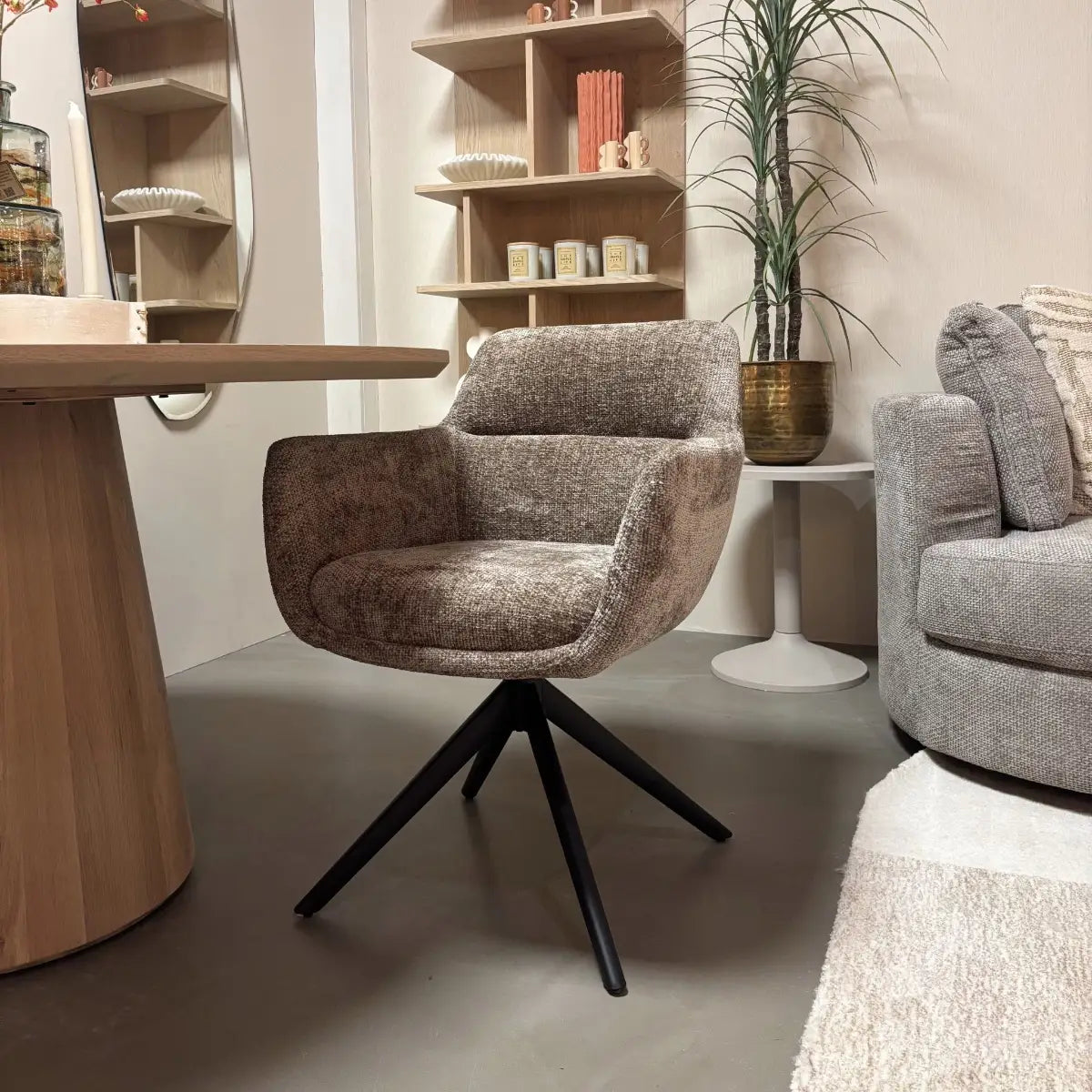 De taupekleurige uitvoering van Stoel Kim van Reefs Interior brengt stijl en functionaliteit perfect samen. De zachte geweven stof in een warme taupetint zorgt voor een rustige, verfijnde uitstraling die naadloos aansluit bij een modern of aards interieur.