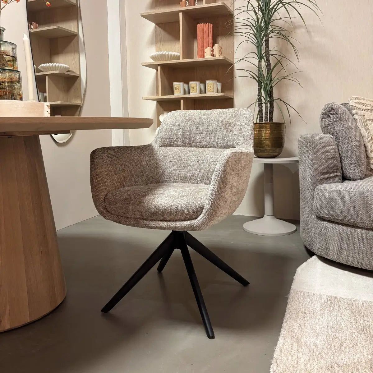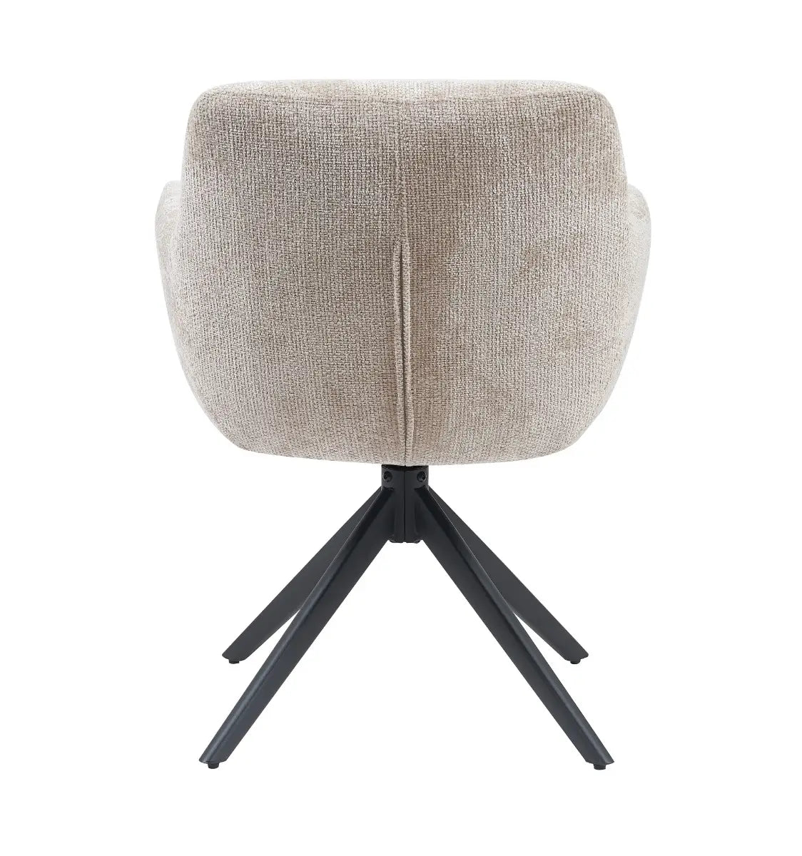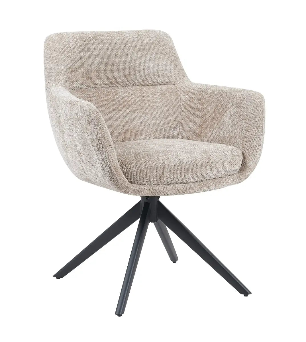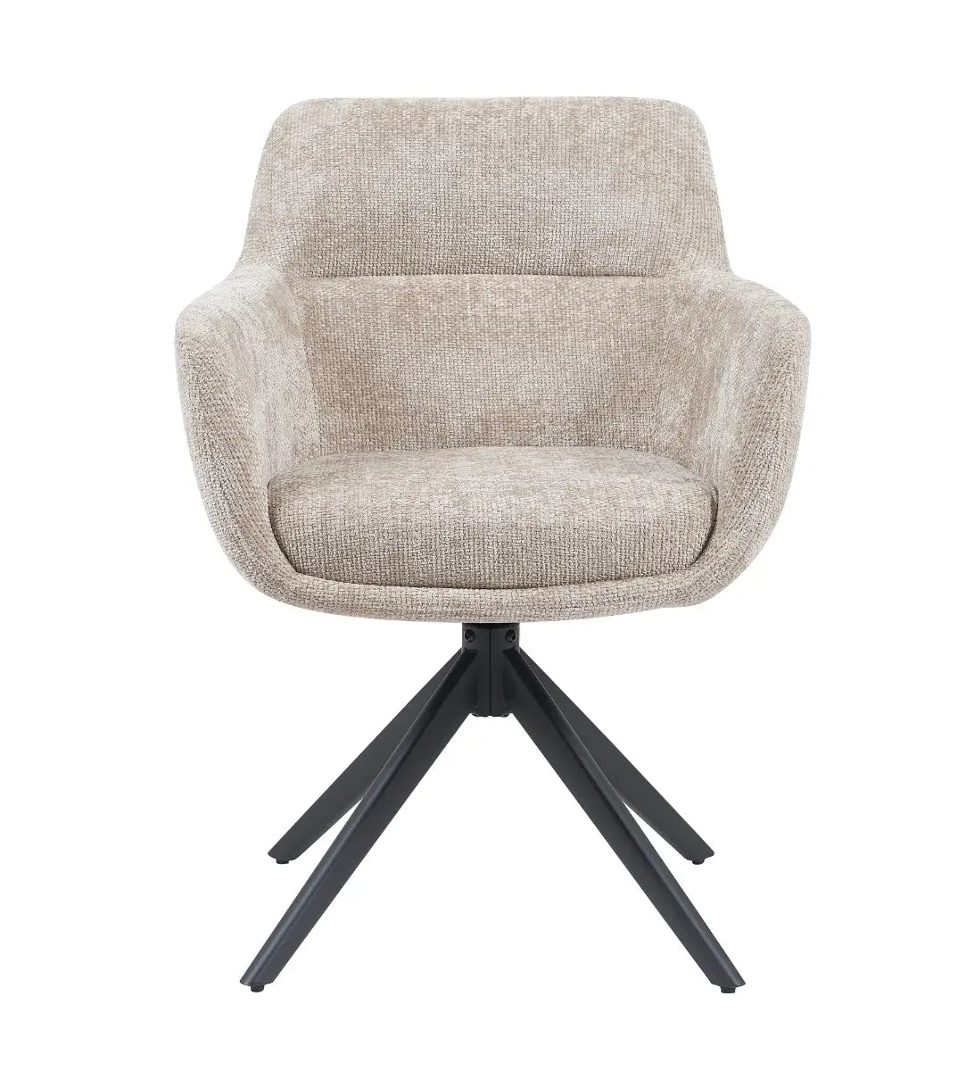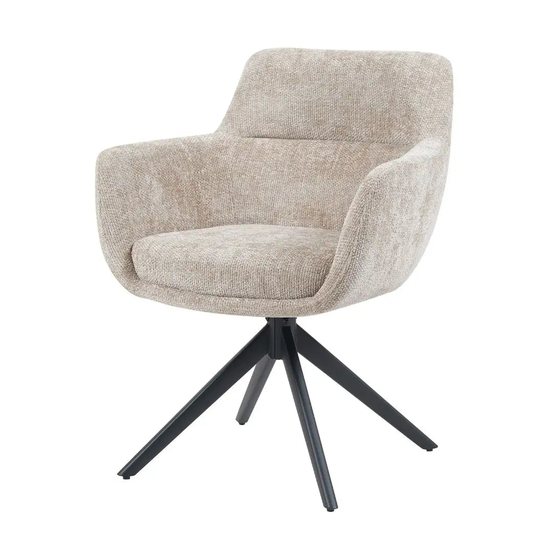 Dankzij het vloeiende ontwerp met geïntegreerde armleuningen en een stevige rugleuning biedt deze stoel een comfortabele zit. De draaifunctie maakt het geheel extra praktisch, terwijl het zwarte metalen onderstel een strak contrast vormt met de lichte stof.