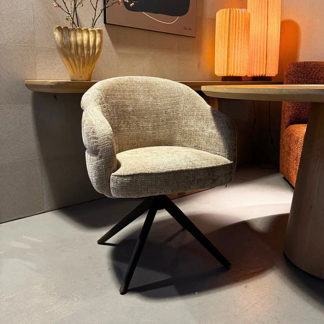 De stoel Lotte van Reefs Interior combineert elegantie met dagelijks comfort. De zachte beige bekleding straalt warmte en rust uit en vormt een perfecte basis voor zowel moderne als klassieke interieurs. Dankzij het 360 graden draaibare frame met terugslagfunctie beweegt de stoel soepel mee en keert hij vanzelf terug naar zijn oorspronkelijke positie. De meegesleurde pootconstructie zorgt voor extra stabiliteit en een hoogwaardige afwerking, ideaal voor intensief gebruik aan de eettafel.