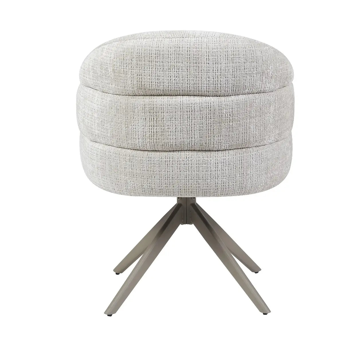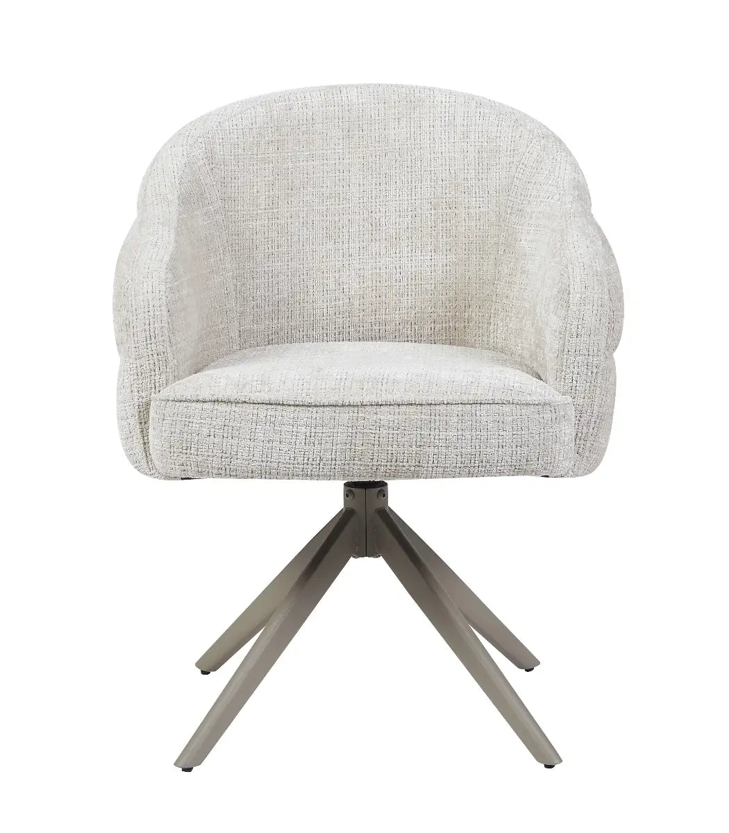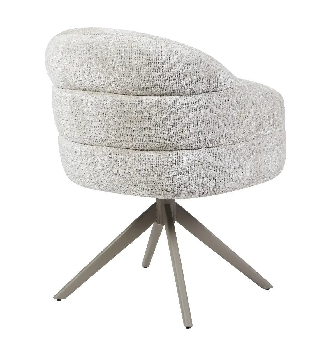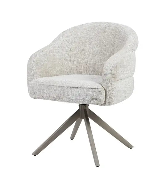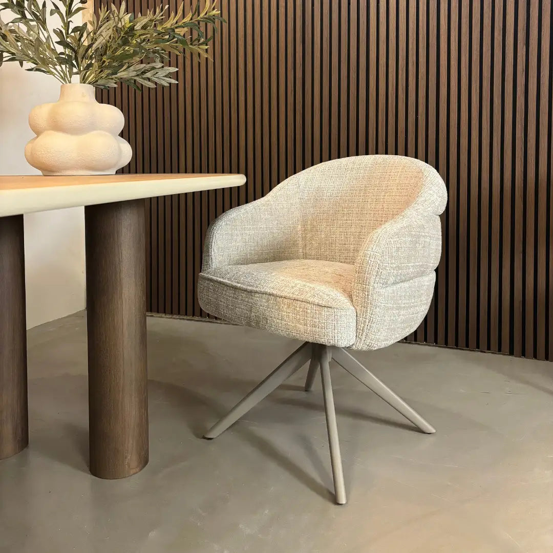 De stoel Lotte van Reefs Interior is een moderne eetkamerstoel die elegantie en comfort op een subtiele manier weet te combineren. De zachte grijze bekleding heeft een verfijnde textuur en straalt rust en luxe uit, waardoor de stoel moeiteloos past in zowel moderne als tijdloze interieurs. Het draaibare frame van metaal zorgt voor een praktische en dynamische zitervaring, want dankzij de 360 graden draaifunctie met terugslag beweegt Lotte soepel mee en keert ze vanzelf terug naar haar oorspronkelijke positie. De meegesleurde pootconstructie geeft de stoel een solide en hoogwaardige afwerking, ideaal voor intensief dagelijks gebruik.