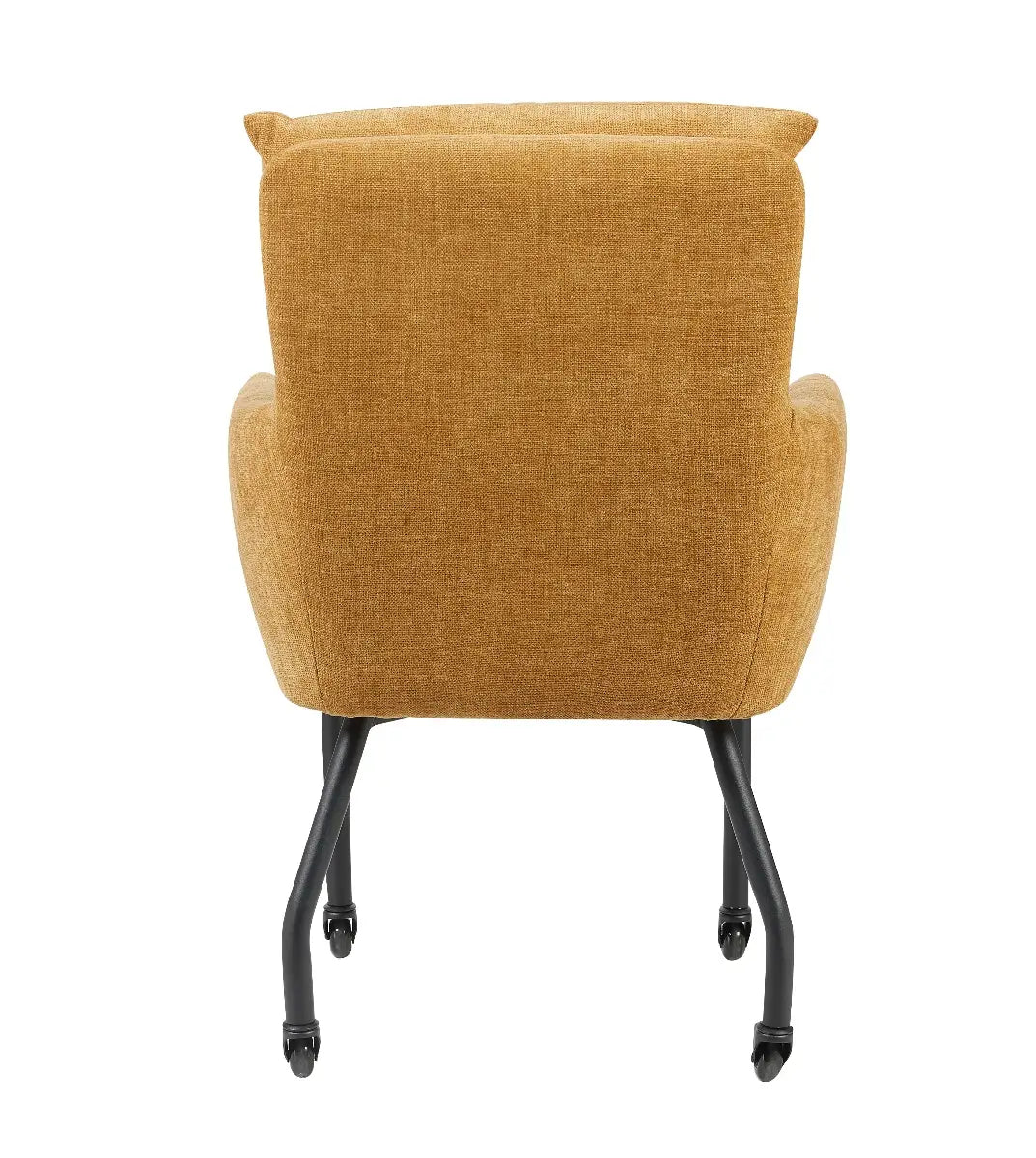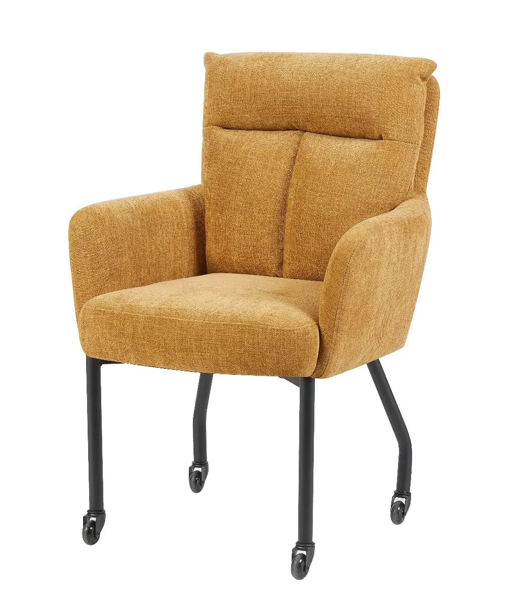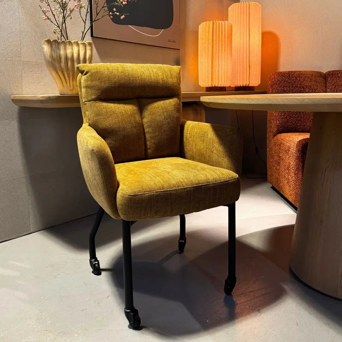 De stoel Maxime van Reefs Interior combineert comfort, kwaliteit en een eigentijdse uitstraling. De zachte bekleding geeft de stoel een warme, stijlvolle look die moeiteloos past in diverse interieurs. Dankzij de skatewieltjes rolt Maxime heerlijk soepel over elke ondergrond, wat hem perfect maakt voor gebruik aan de eettafel of in een moderne werkruimte. Het stevige metalen frame zorgt voor een stabiele basis, terwijl de subtiel afgeronde vormen van de zitting en rugleuning bijdragen aan het comfortabele karakter van de stoel.