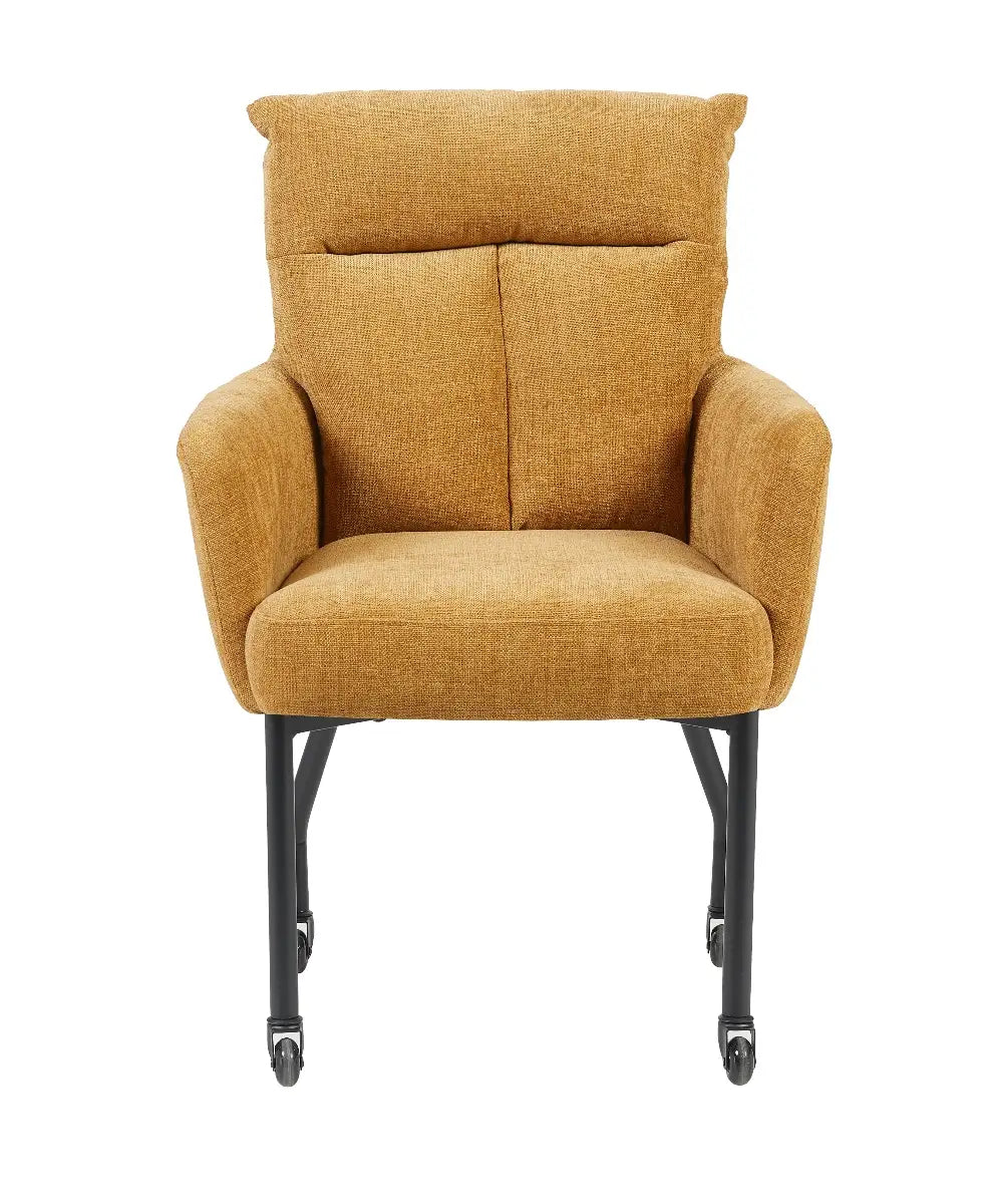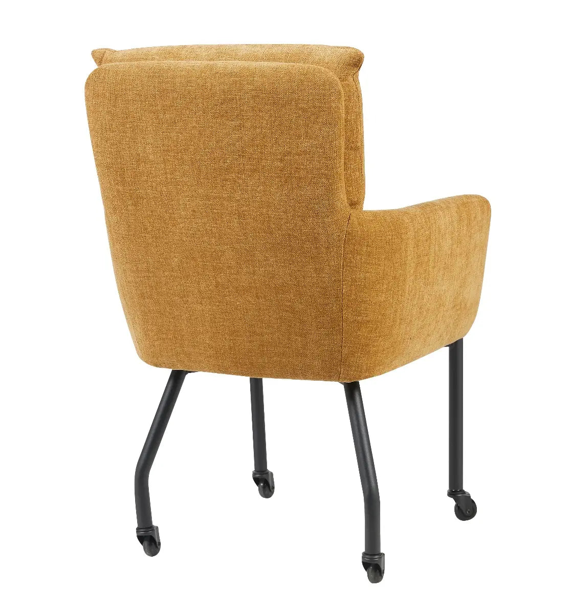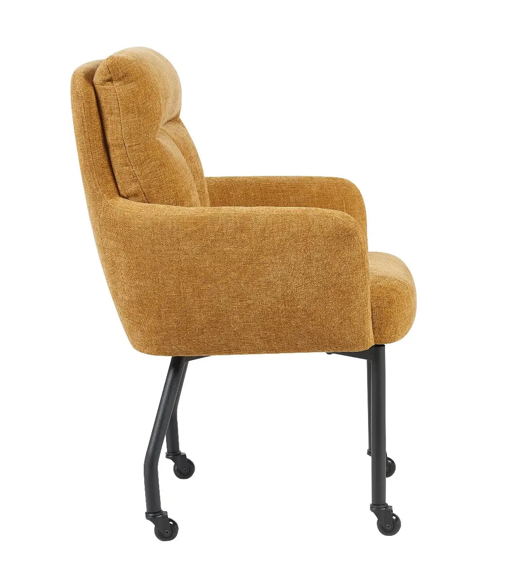 De stoel Maxime van Reefs Interior combineert comfort, kwaliteit en een eigentijdse uitstraling. De zachte bekleding geeft de stoel een warme, stijlvolle look die moeiteloos past in diverse interieurs. Dankzij de skatewieltjes rolt Maxime heerlijk soepel over elke ondergrond, wat hem perfect maakt voor gebruik aan de eettafel of in een moderne werkruimte. Het stevige metalen frame zorgt voor een stabiele basis, terwijl de subtiel afgeronde vormen van de zitting en rugleuning bijdragen aan het comfortabele karakter van de stoel.