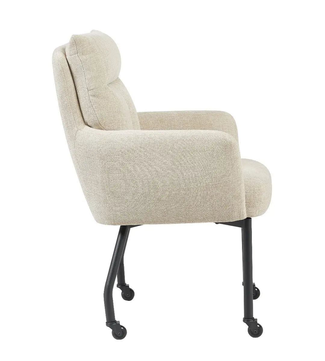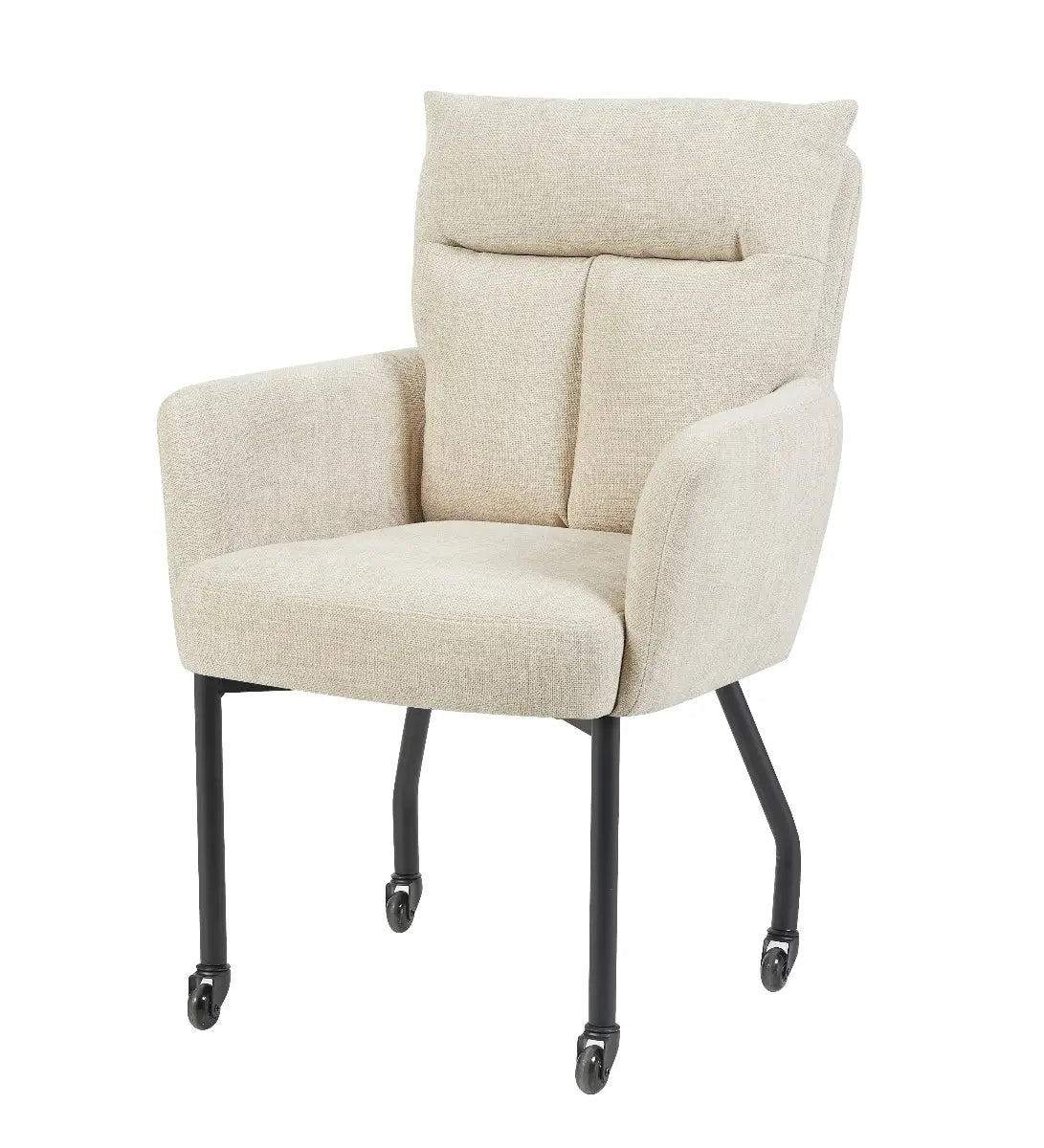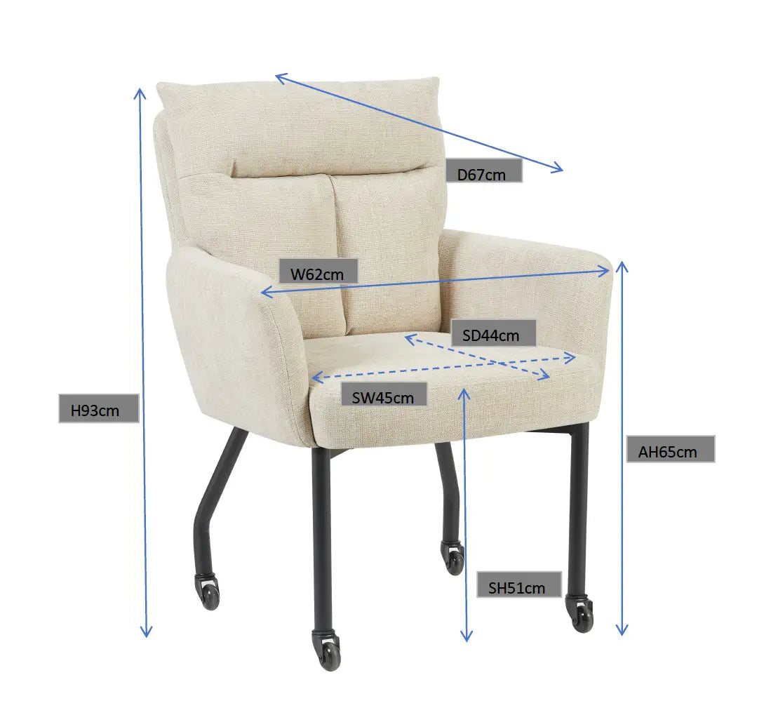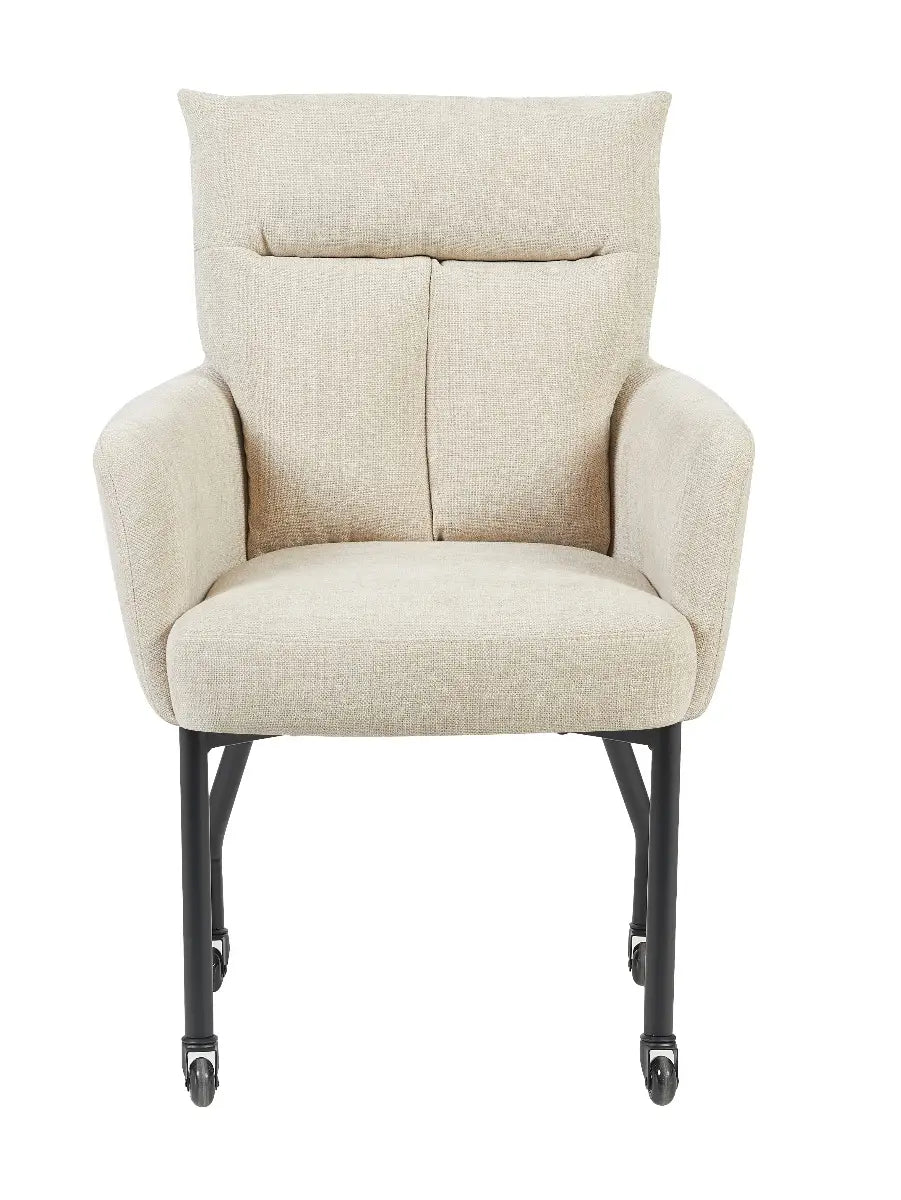 De stoel Maxime van Reefs Interior combineert comfort, kwaliteit en een eigentijdse uitstraling. De zachte bekleding geeft de stoel een warme, stijlvolle look die moeiteloos past in diverse interieurs. Dankzij de skatewieltjes rolt Maxime heerlijk soepel over elke ondergrond, wat hem perfect maakt voor gebruik aan de eettafel of in een moderne werkruimte. Het stevige metalen frame zorgt voor een stabiele basis, terwijl de subtiel afgeronde vormen van de zitting en rugleuning bijdragen aan het comfortabele karakter van de stoel.