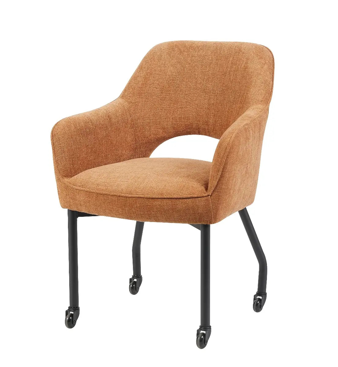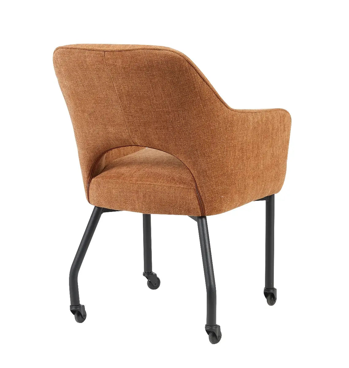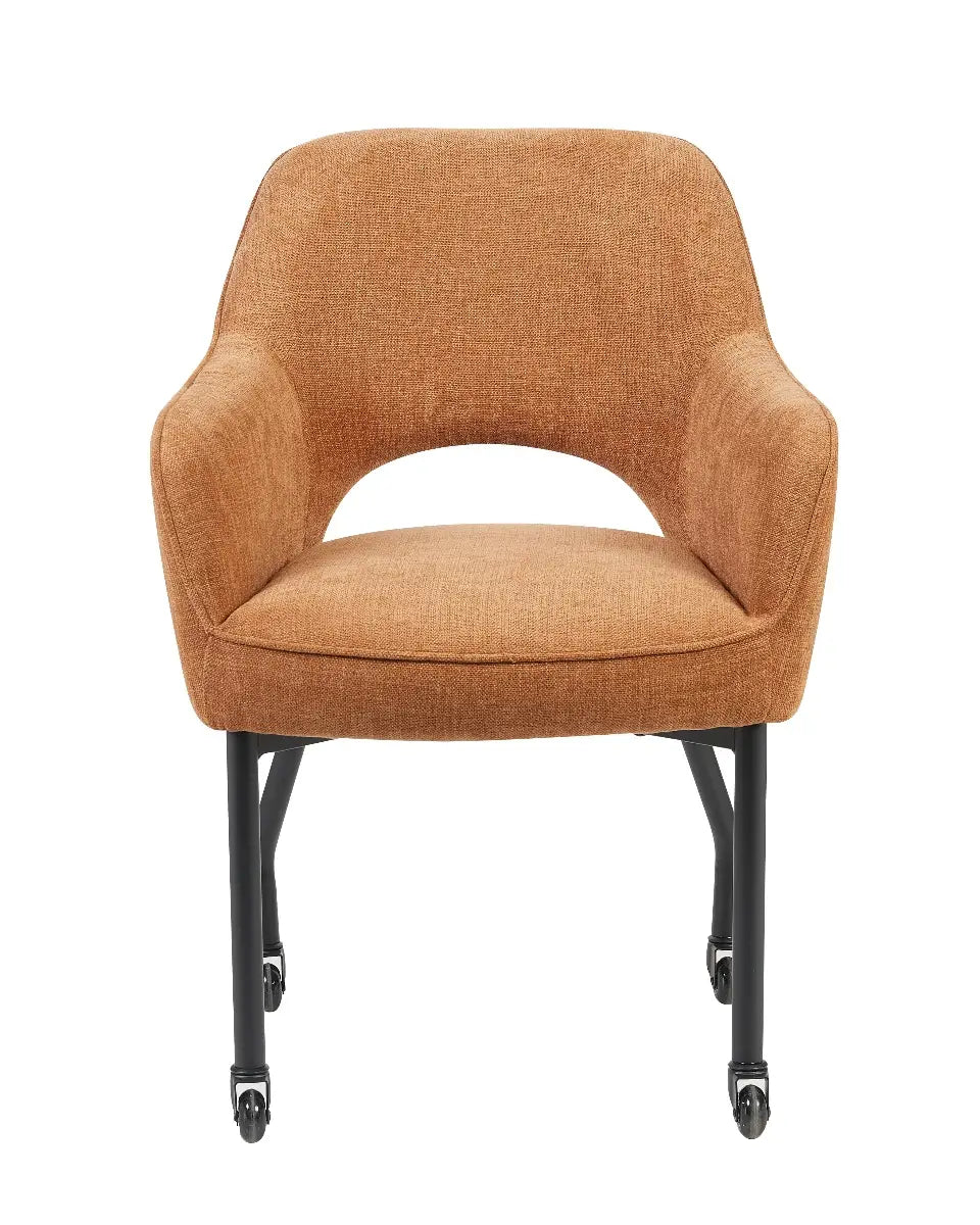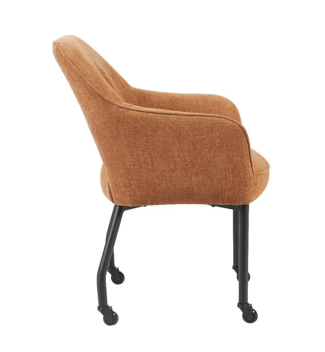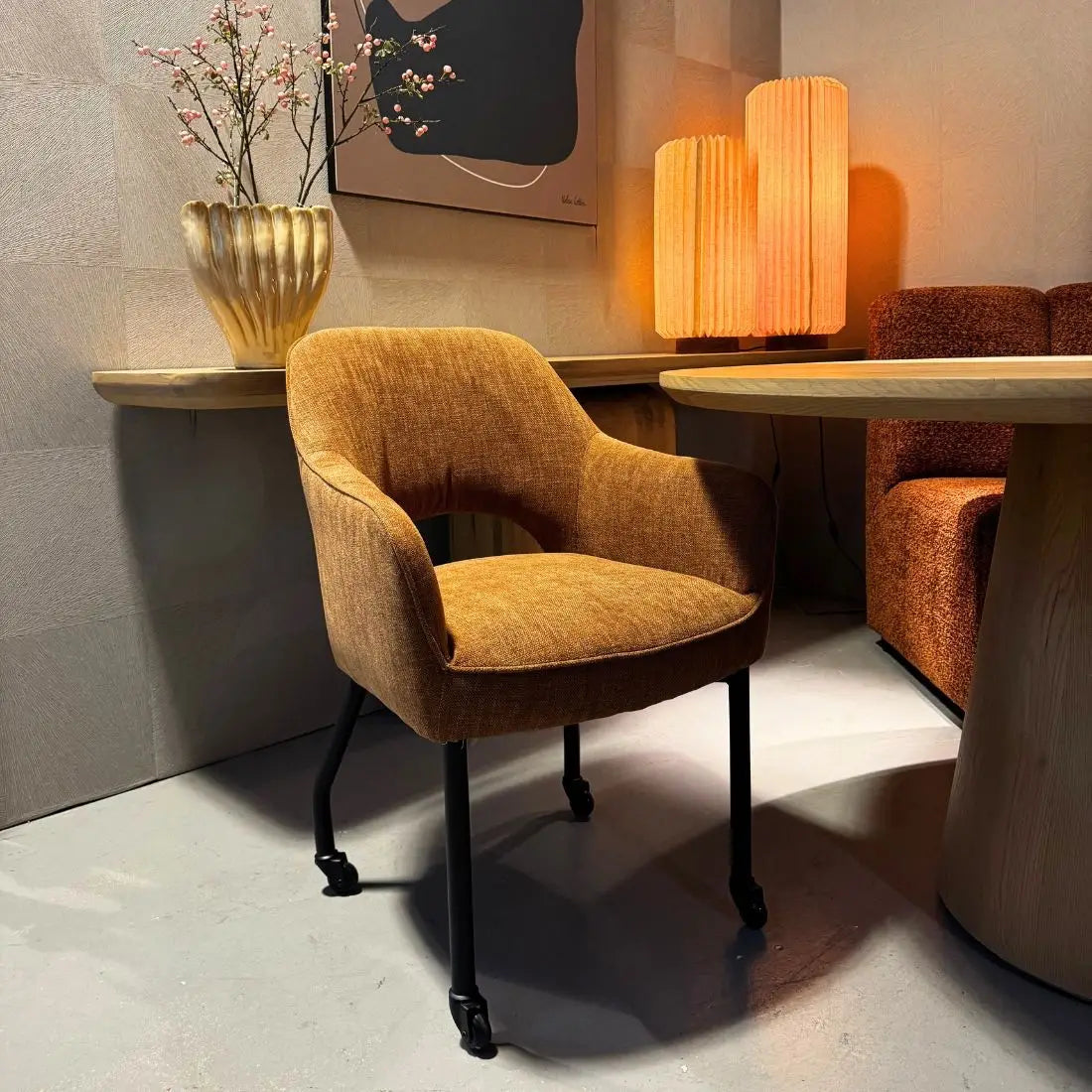 De stoel Sofia van Reefs Interior combineert comfort, elegantie en gebruiksgemak in één stijlvol ontwerp. De warme koperkleurige bekleding geeft de stoel een rijke, sfeervolle uitstraling die direct karakter toevoegt aan je interieur. Het zwarte metalen frame met skatewieltjes maakt de stoel praktisch in gebruik, want Sofia rolt soepel over elke ondergrond en biedt daarmee ultiem gemak aan de eettafel of in een moderne werkruimte.
