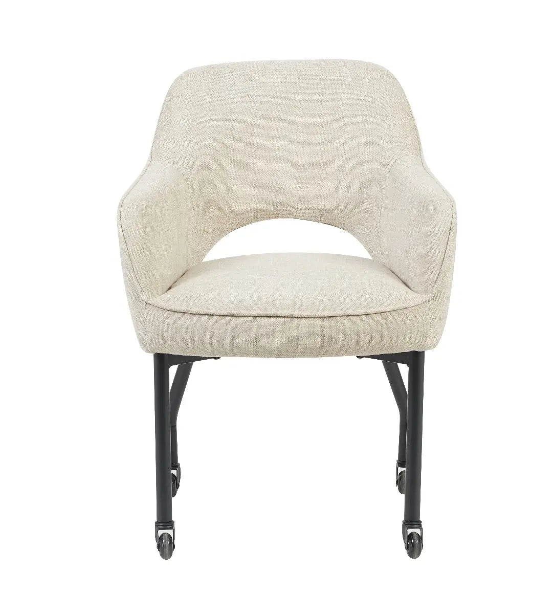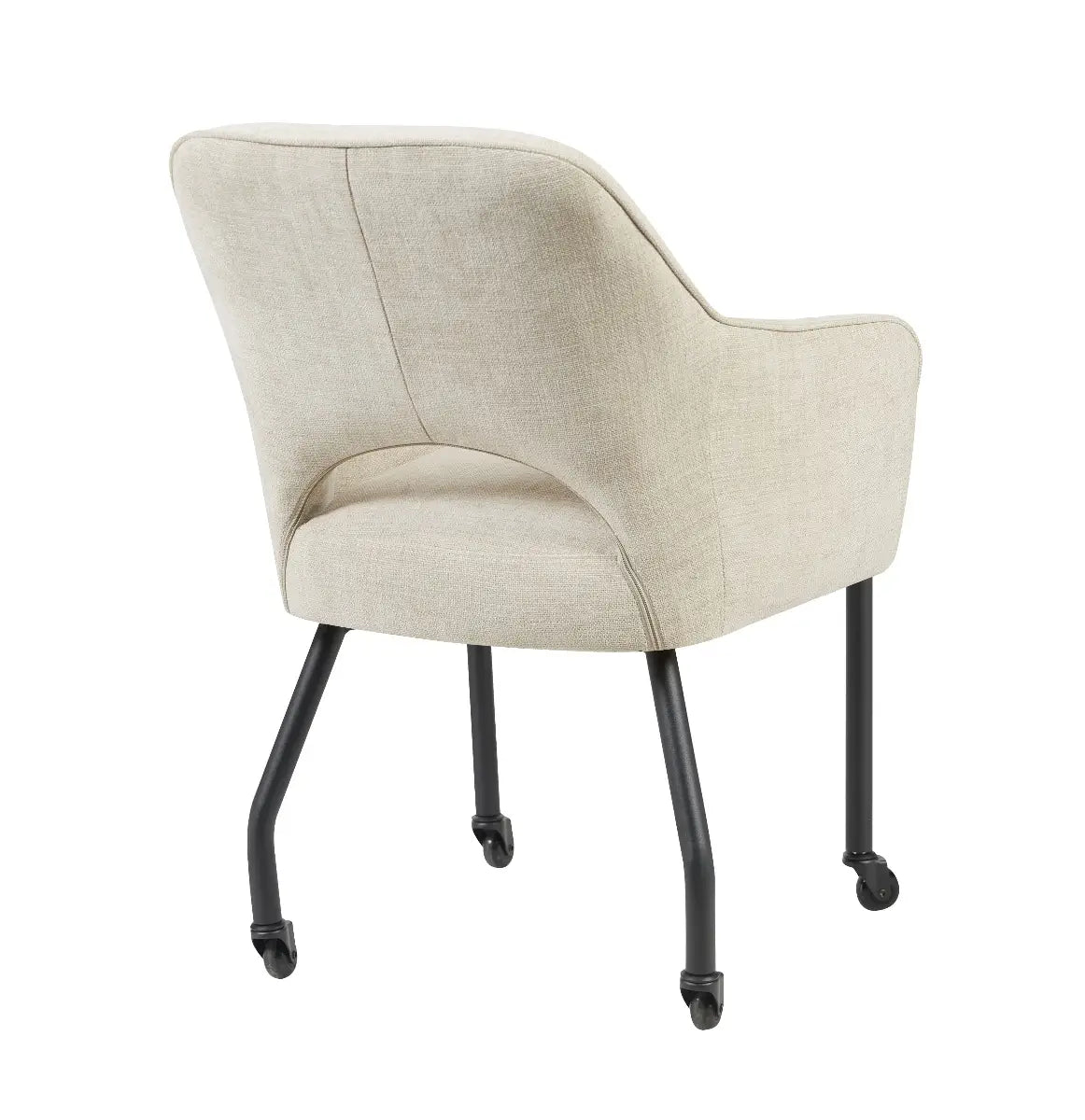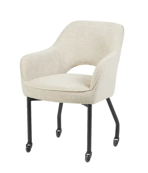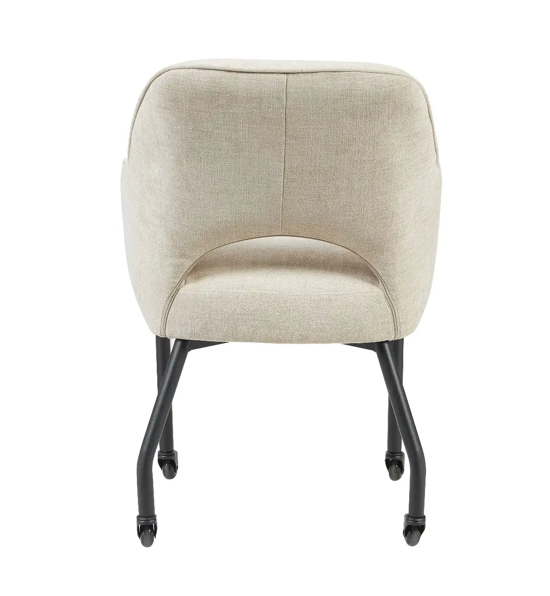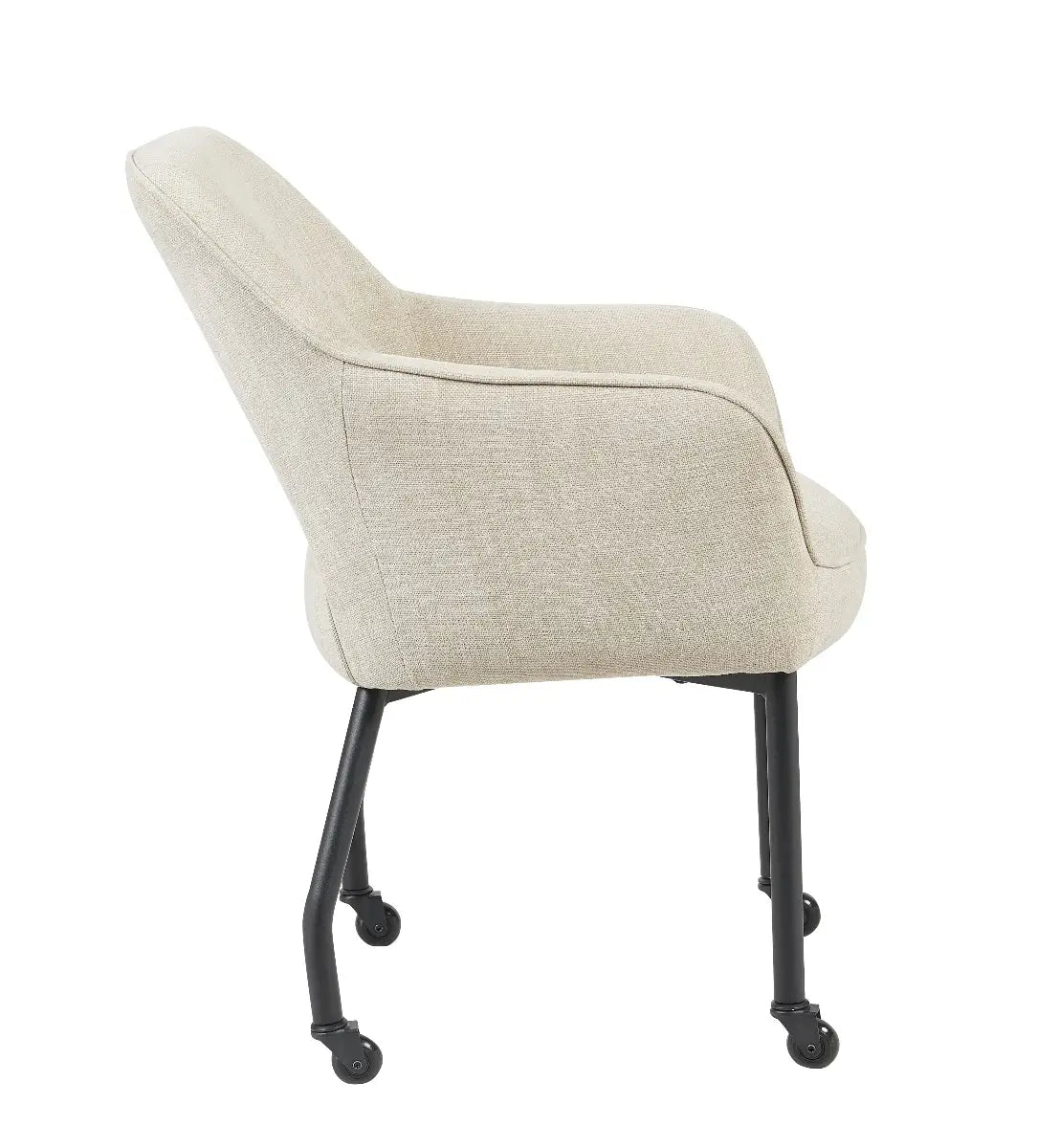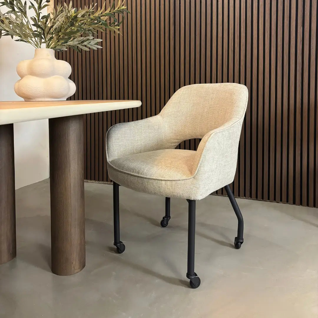 De stoel Sofia van Reefs Interior is de perfecte mix van elegantie, comfort en functionaliteit. De zachte bekleding in een warme natural tint straalt rust en verfijning uit, waardoor deze stoel moeiteloos past in zowel moderne als klassieke interieurs. Het zwart metalen frame met skatewieltjes zorgt voor een speelse en praktische touch, want Sofia rolt soepel over elke vloer en biedt maximale bewegingsvrijheid aan tafel.