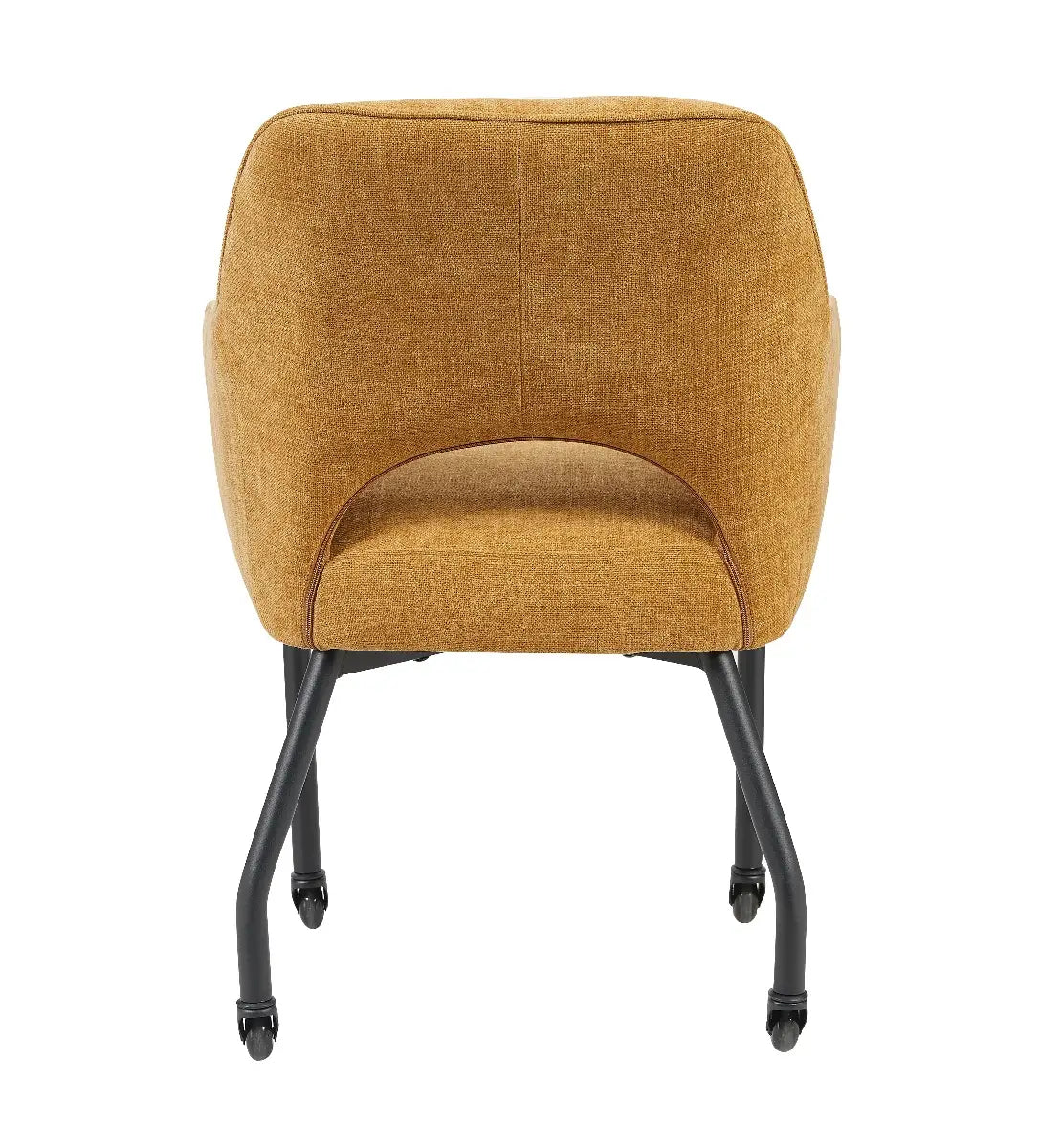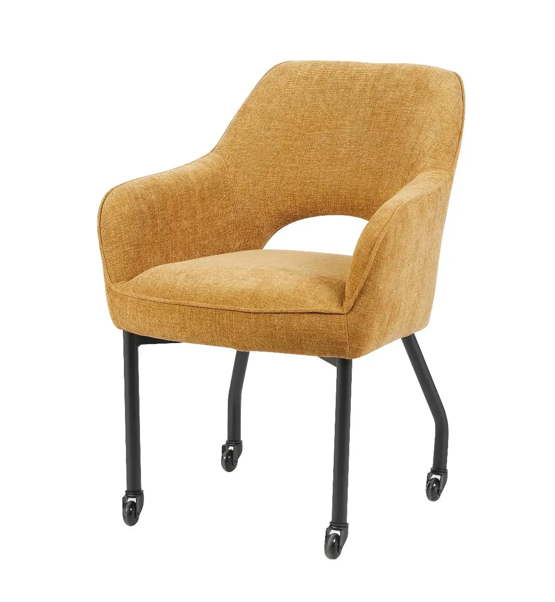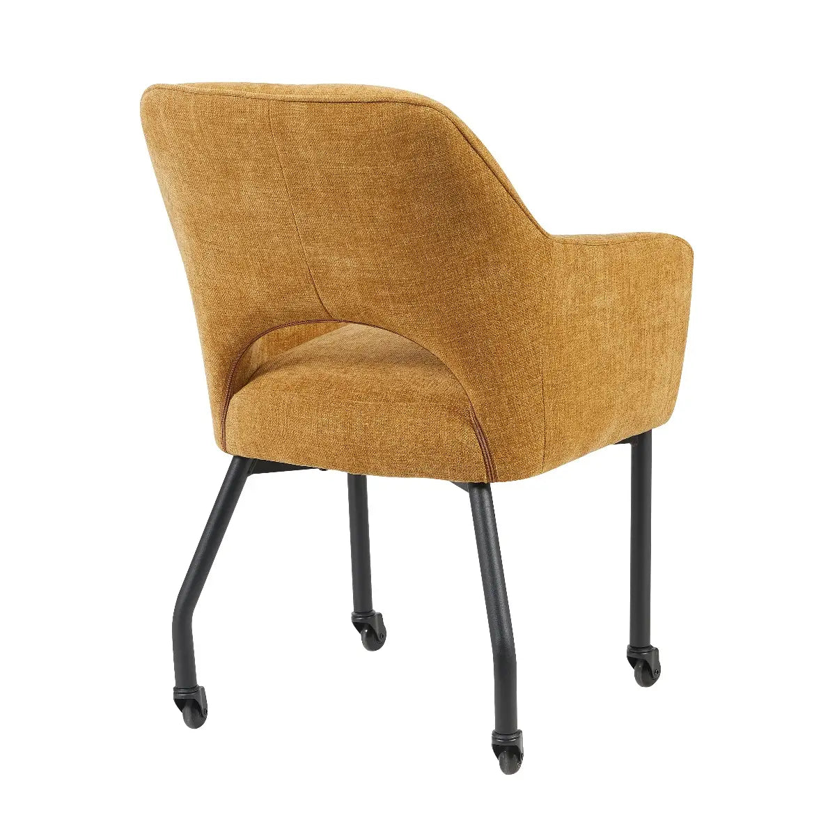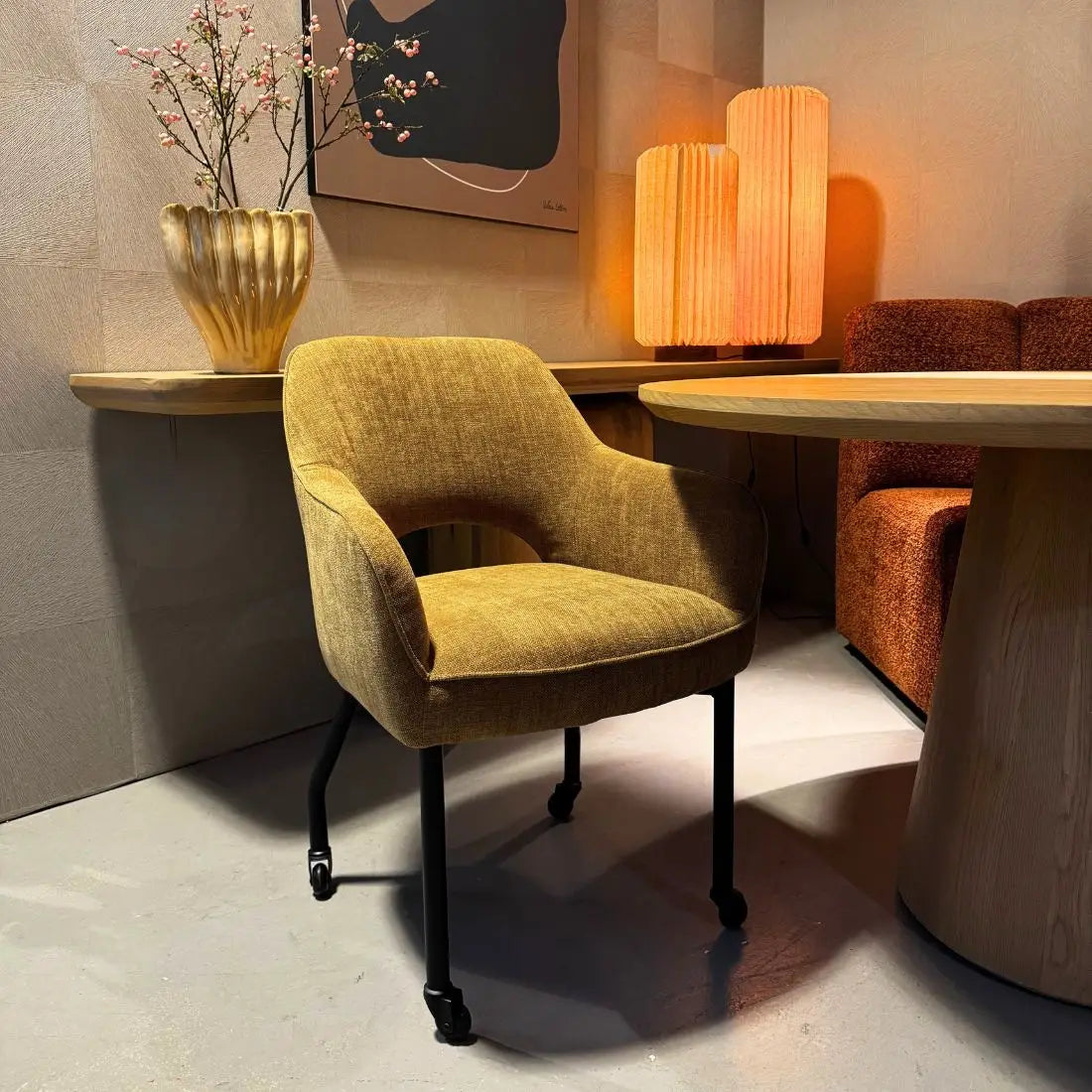 De stoel Sofia van Reefs Interior straalt warmte en elegantie uit dankzij haar mosterdkleurige bekleding en verfijnde vormgeving. De ronde lijnen geven de stoel een zachte, moderne uitstraling, terwijl de subtiele opening in de rugleuning zorgt voor een luchtig en eigentijds karakter. Het zwarte metalen frame met skatewieltjes maakt Sofia niet alleen stijlvol maar ook bijzonder praktisch, want de stoel rolt soepel over elke vloer en biedt optimaal gebruiksgemak aan tafel.