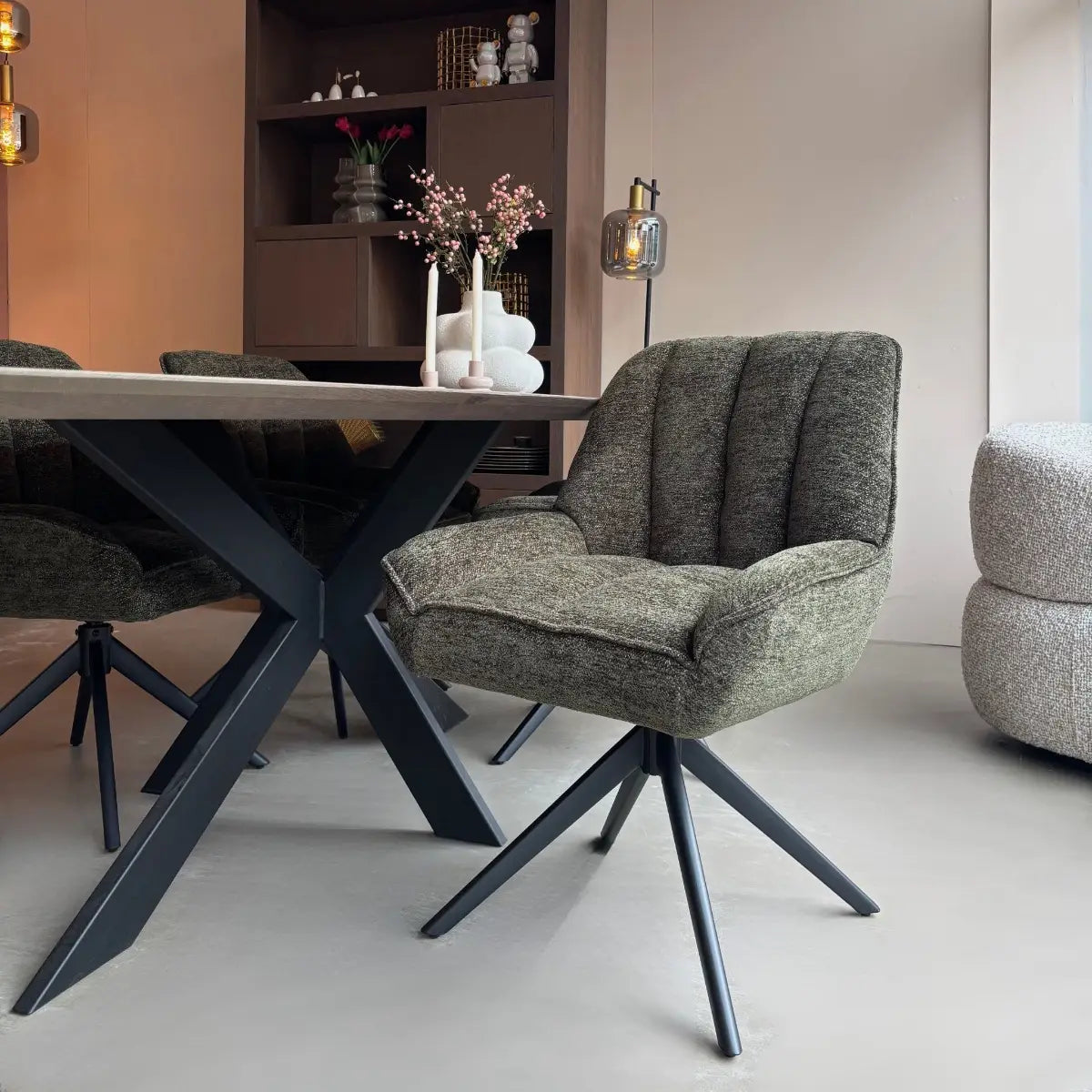 De draaifunctie met terugdraaiend mechanisme maakt de stoel geschikt voor dagelijks gebruik, aan tafel of als accentstoel. Met deze groene variant geef je jouw ruimte een frisse, stijlvolle twist – met net wat meer lef.