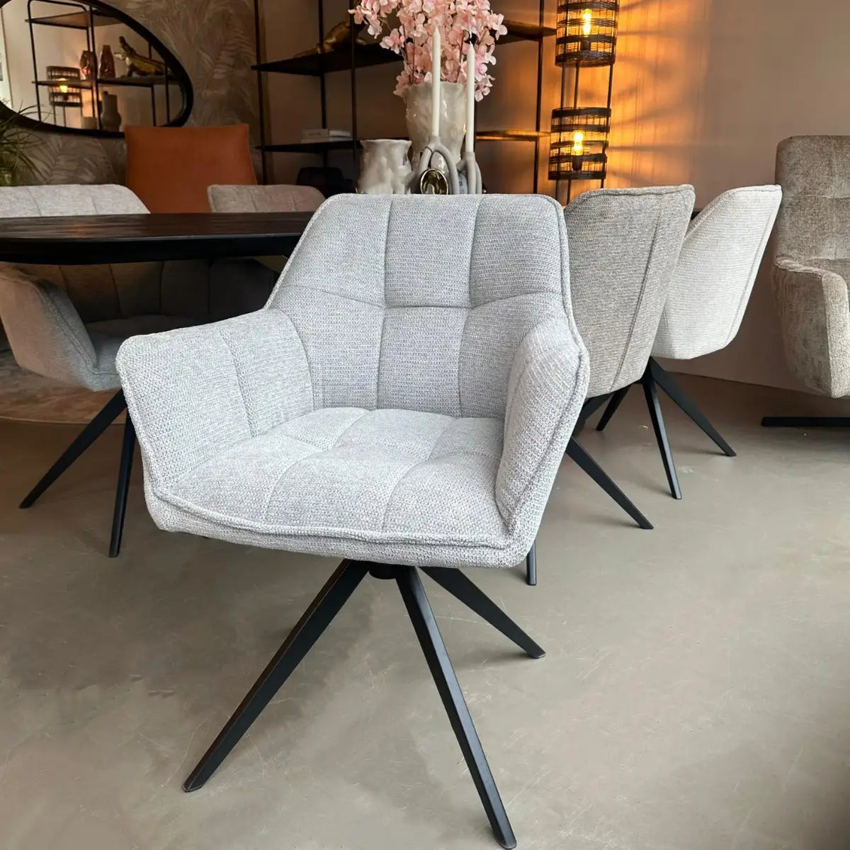 Een extra praktische eigenschap van de "Elodie" is de 360 graden draaibare zitting met automatische terugslag. Dit biedt flexibiliteit in gebruik, terwijl de stoel altijd netjes terugkeert naar zijn oorspronkelijke positie. Deze slimme combinatie van stijl en functionaliteit maakt de Reefs Interior stoel "Elodie" een ideale keuze voor elk modern interieur.