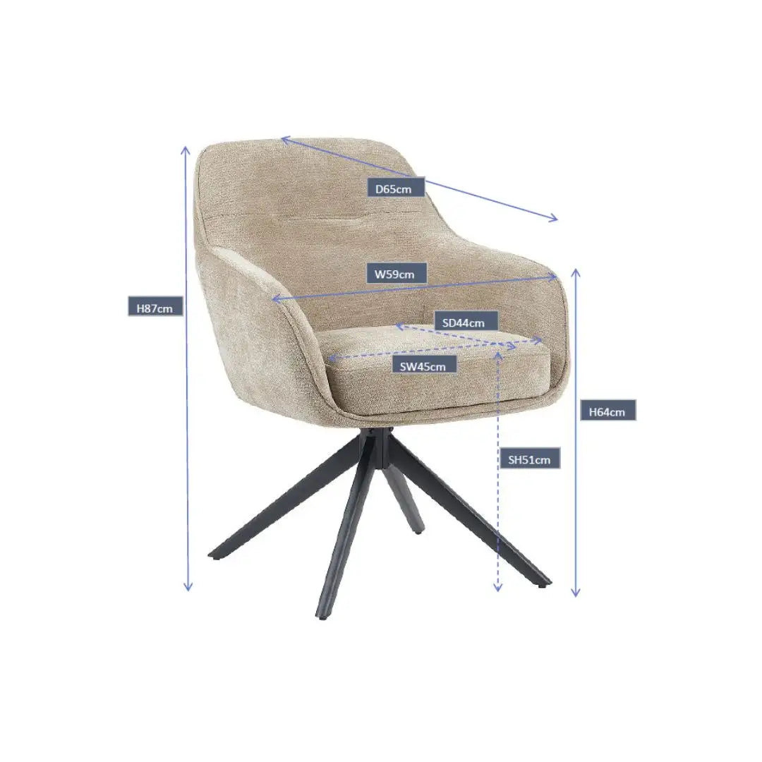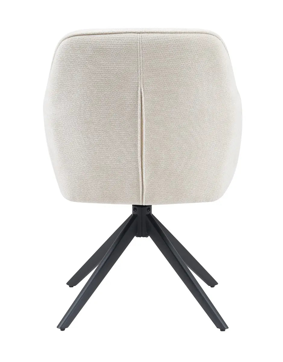 Of je haar nu aan de eettafel zet of in een knusse leeshoek plaatst – Esmee biedt altijd comfort dankzij de luxe zitting, armleuningen en ondersteunende rug. Het zwarte onderstel zorgt voor een stijlvol contrast, en de draaifunctie met terugkeer maakt haar bovendien praktisch in gebruik. Beige is een tijdloze keuze die rust brengt in elk interieur.