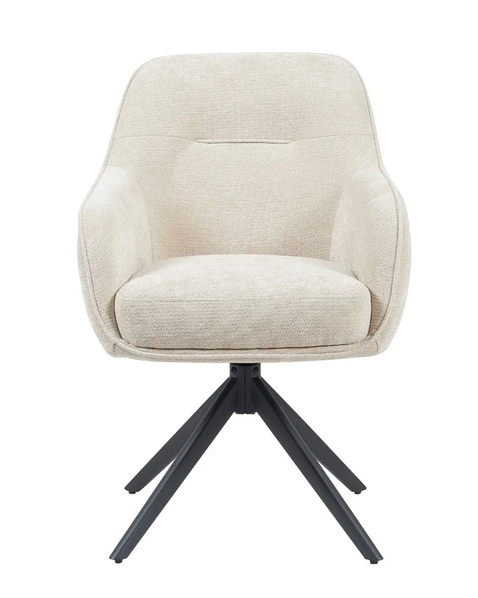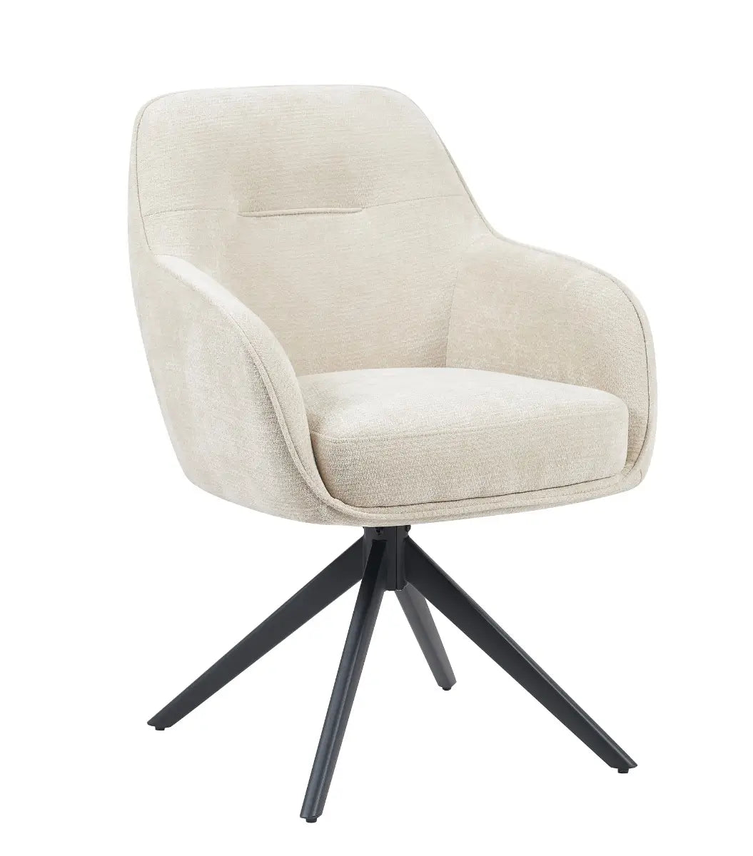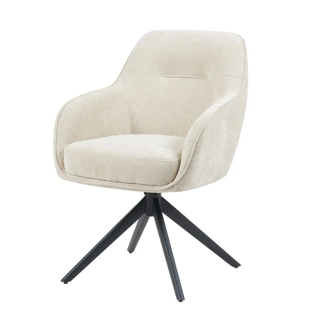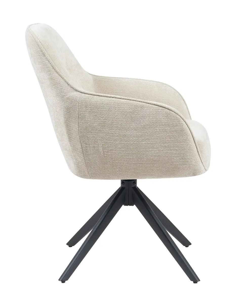 De royale zitting, prettige armleuningen en hoge rug zorgen voor aangenaam zitcomfort, terwijl het slanke zwarte onderstel de stoel een moderne uitstraling geeft. Dankzij de draaifunctie met automatische terugkeer is Stoel Esmee in natural niet alleen mooi, maar ook uiterst functioneel.