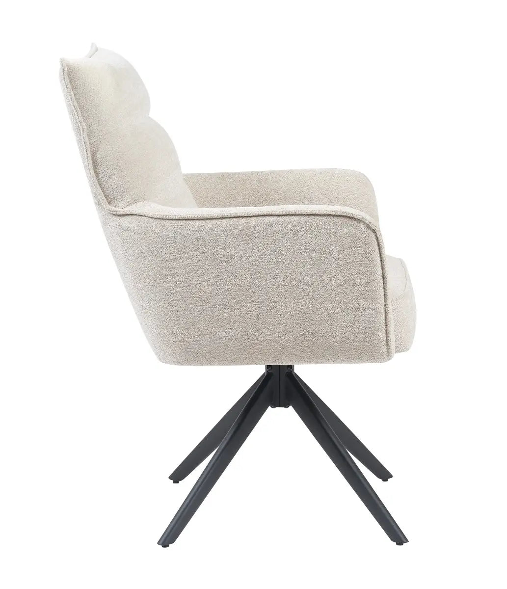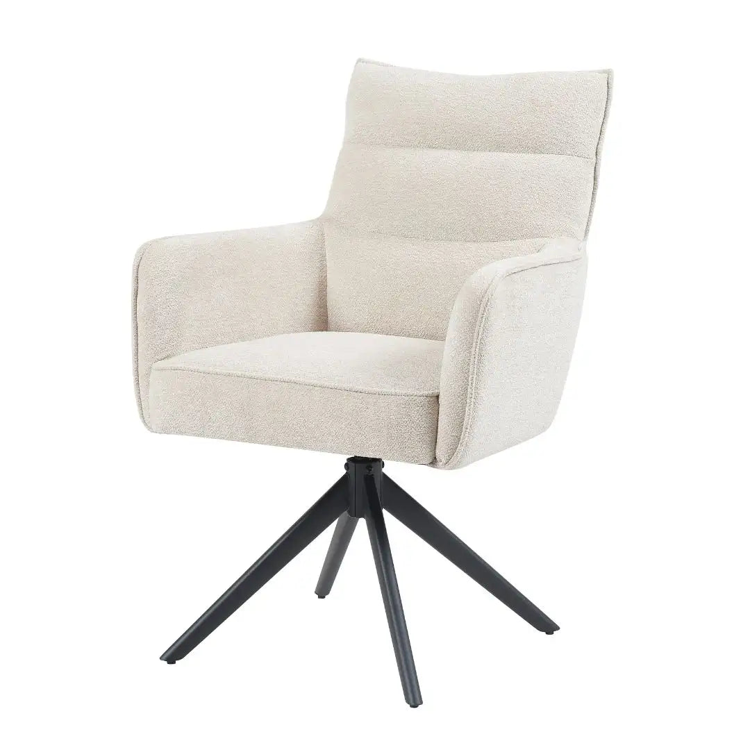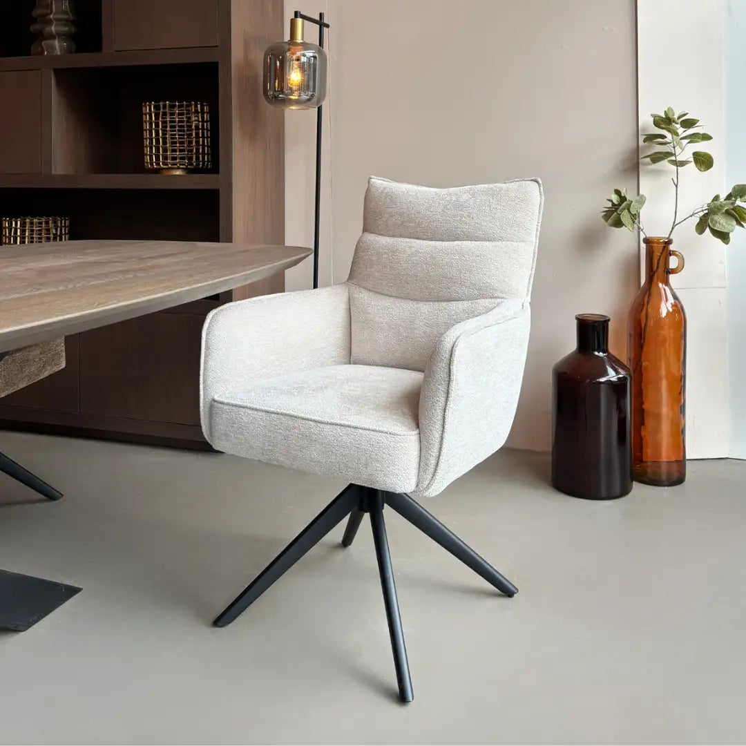 Achter het zachte uiterlijk gaat verrassend veel comfort schuil: de zitting met pocketvering biedt langdurige ondersteuning, terwijl de draaifunctie met terugdraai-mechanisme zorgt voor gemak in gebruik. Of je hem nu aan een lichte eettafel zet of juist als contrast bij donkere accenten, Paul in natural voelt zich overal thuis.