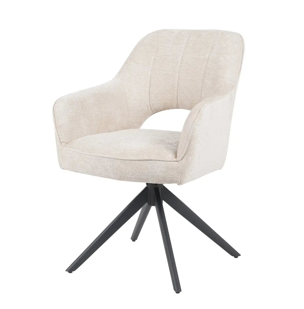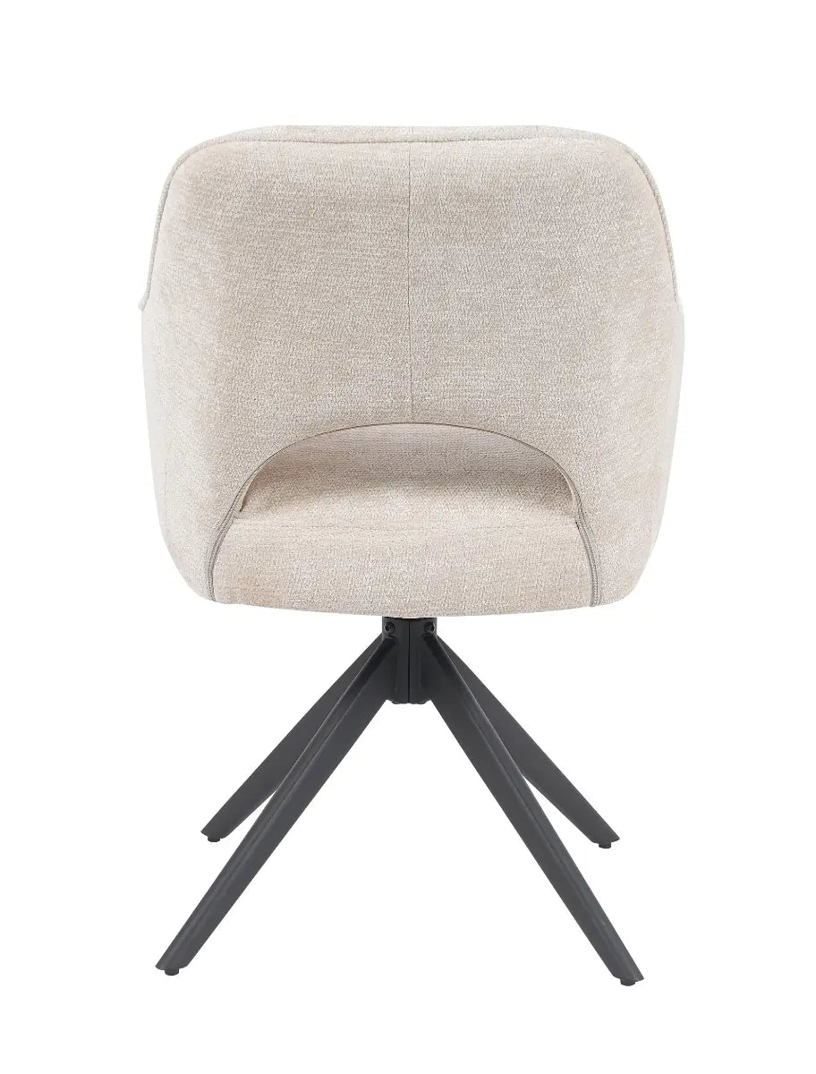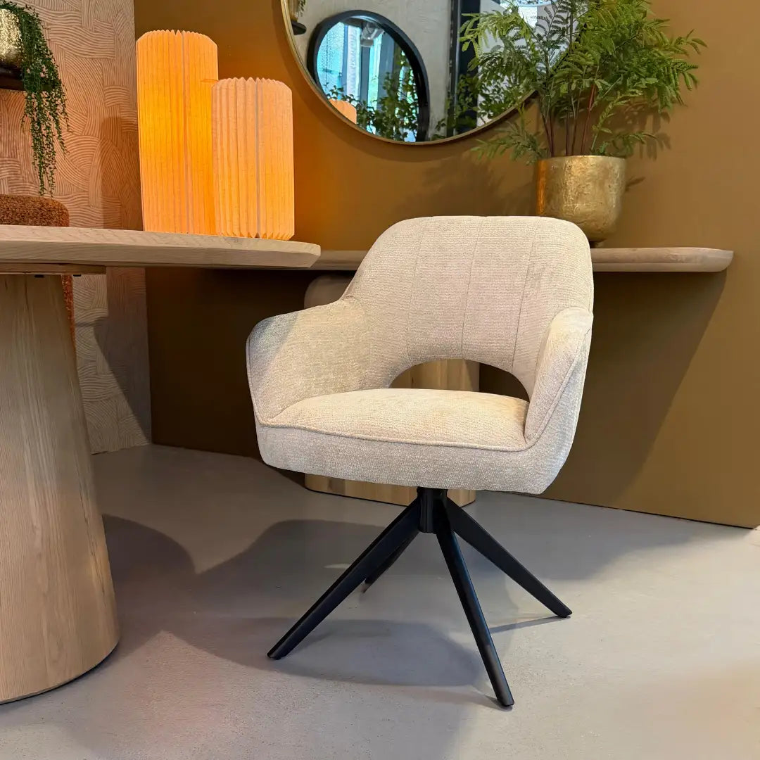 Met een hoogte van 86 cm, een breedte van 60 cm en een zithoogte van 51 cm biedt de Sofie een royale en comfortabele zit. De zitdiepte van 53 cm en zitbreedte van 44 cm maken hem ideaal voor lange, ontspannen diners of gezellige avonden aan tafel. Het zwarte metalen onderstel met speels uitlopende poten zorgt voor stabiliteit en geeft de stoel een stoer contrast. Dankzij de 360 graden draaifunctie met auto-return draai je soepel mee aan tafel en keert de stoel automatisch terug naar de oorspronkelijke stand – praktisch én stijlvol. De hoogwaardige afwerking en duurzame materialen maken de Sofie een elegante en functionele keuze voor dagelijks gebruik.